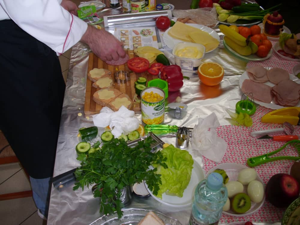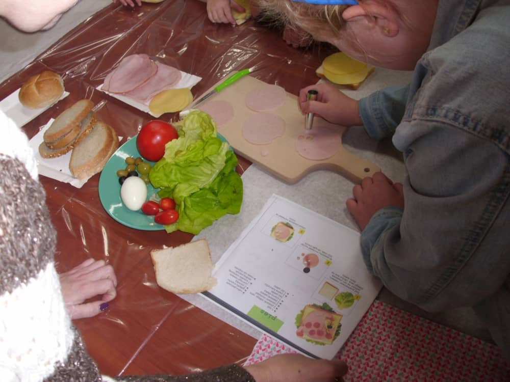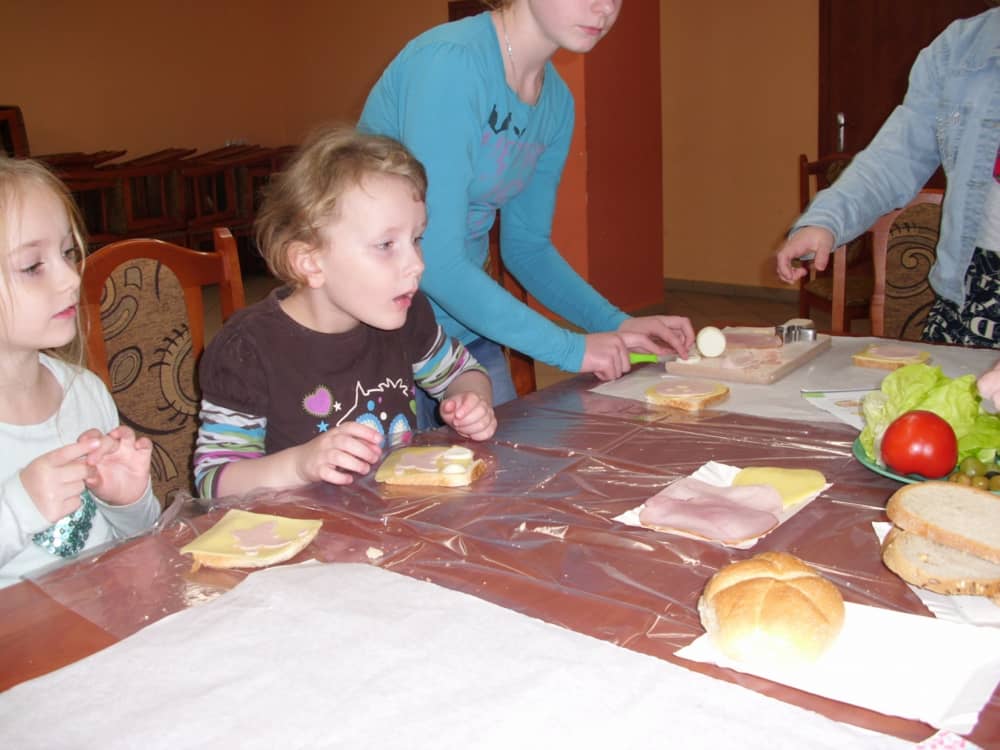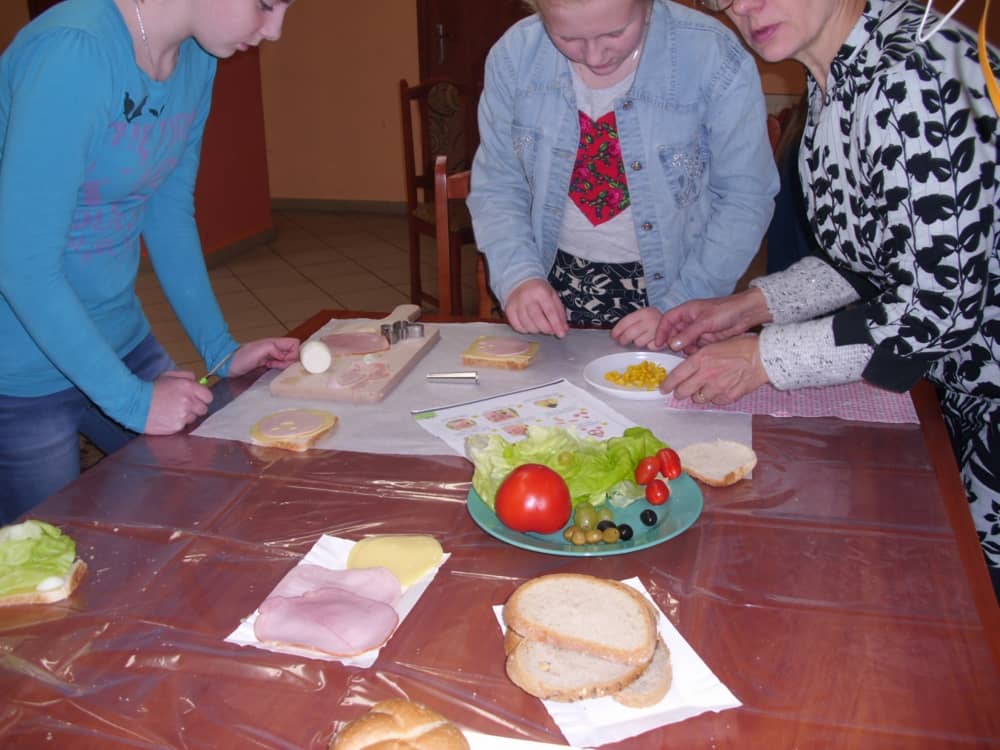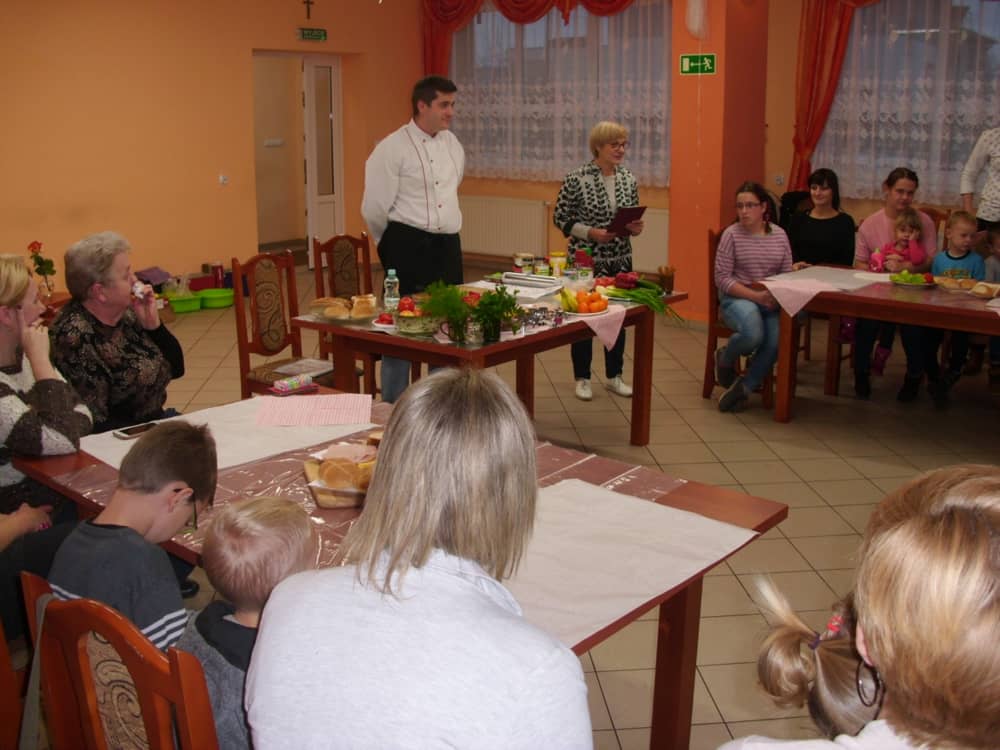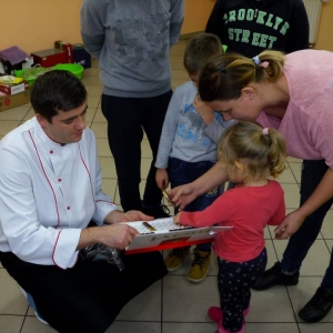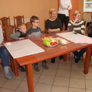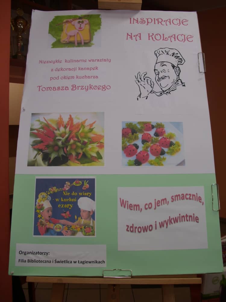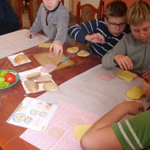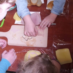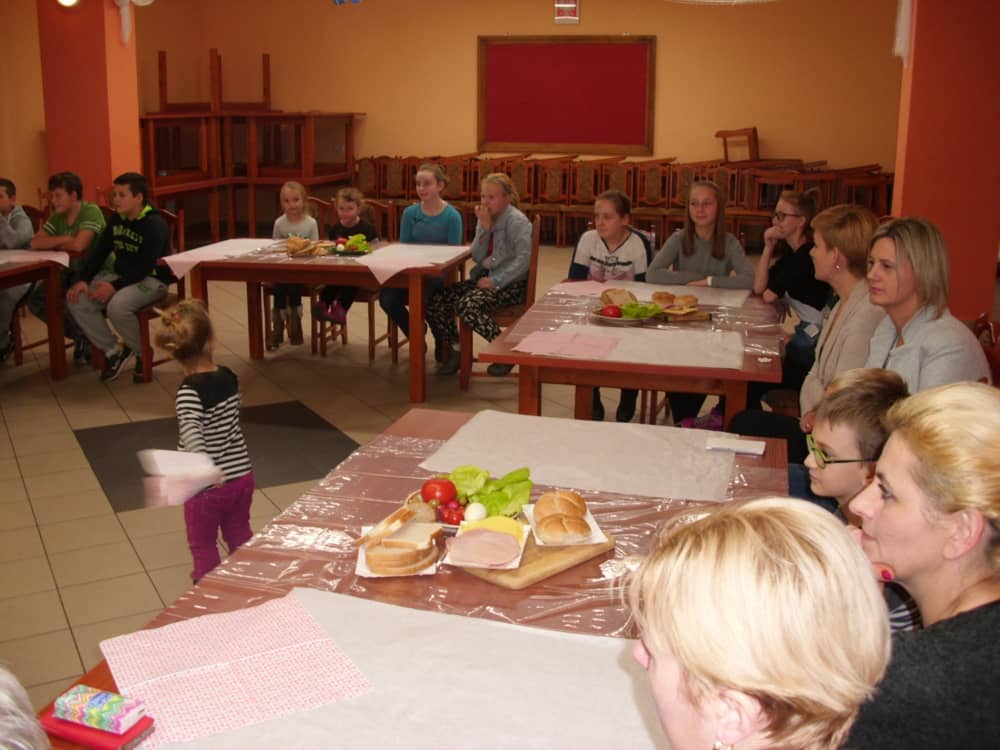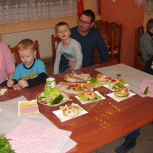 Honorowym gościem, a jednocześnie prowadzącym był zawodowy kucharz Tomasz Brzykcy. Opowiedział uczestnikom o zdrowych produktach, zademonstrował przyrządy służące do ozdabiania potraw, z których korzysta w kuchni. Z warzyw i owoców wyczarował telefon, imbryk, serwis do herbaty. Z pieczywa powstała krowa oraz lew. Po interesującym pokazie, dzieci pod okiem rodziców, babć i opiekunów, (przy dużej dawce śmiechu) same tworzyły kanapkowe cuda. Na koniec nastąpiła demonstracja dzieł i długo wyczekiwana konsumpcja.