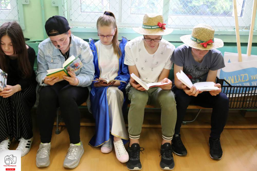 Po przywitaniu wszystkich zgromadzonych, pani dyrektor z Biblioteki Publicznej krótko omówiła ideę bicia rekordu w czytaniu i hasła Jak nie czytam, jak czytam. Następnie wyznaczone osoby z poszczególnych klas głośno czytały fragmenty swoich ulubionych powieści. W dalszej części spotkania, każdy czytał indywidualnie w ciszy przyniesioną książkę.