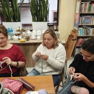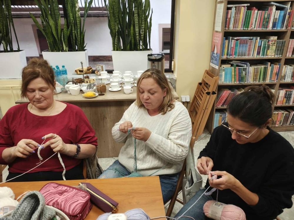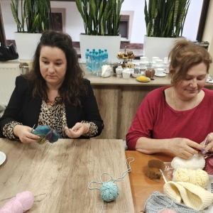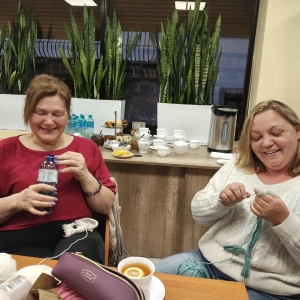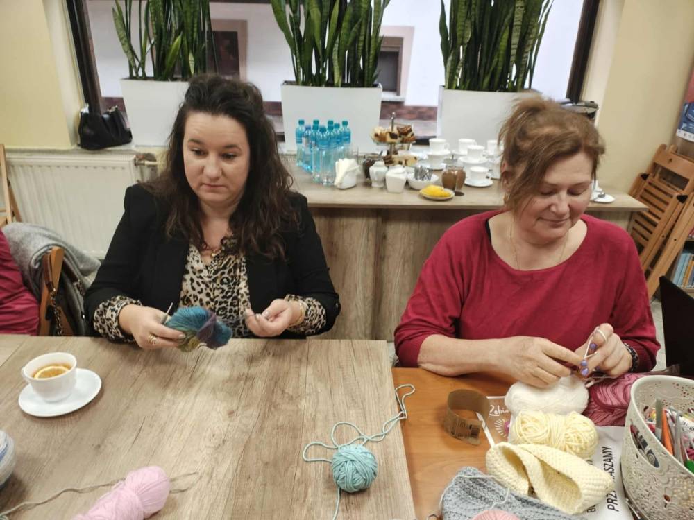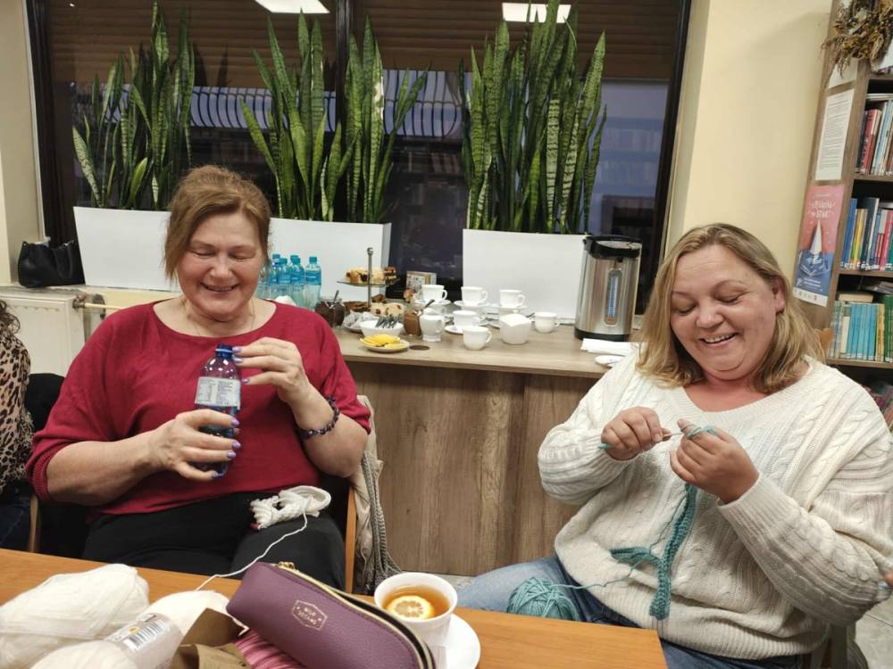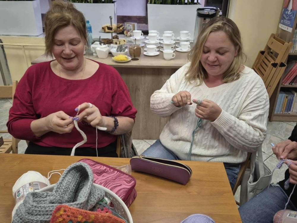 Galeria przedstawia zdjęcia z warsztatów szydełkowych. Obecne Panie siedzą przy stole. Roześmiane rozmawiają, jednocześnie szydełkując opaski na głowę. Piją kawę oraz jedzą ciasto.