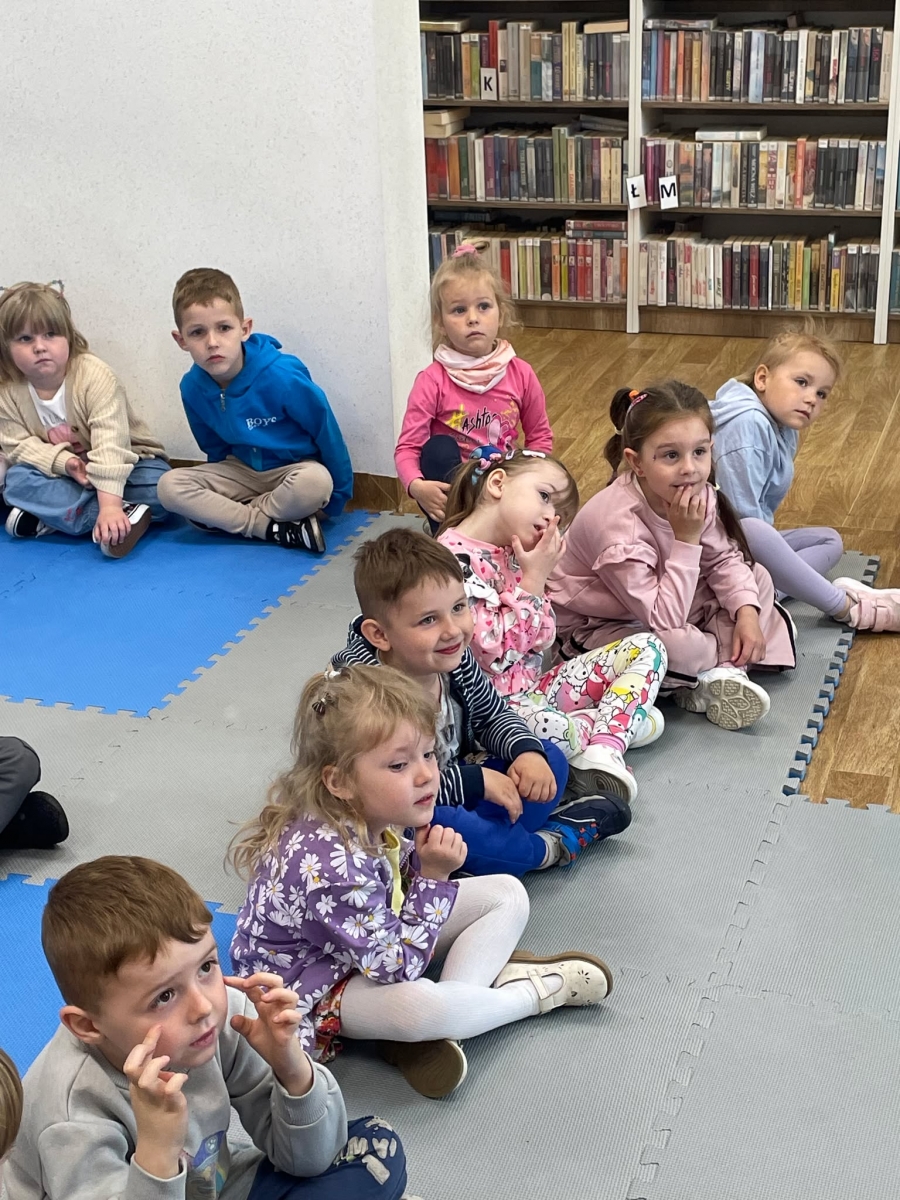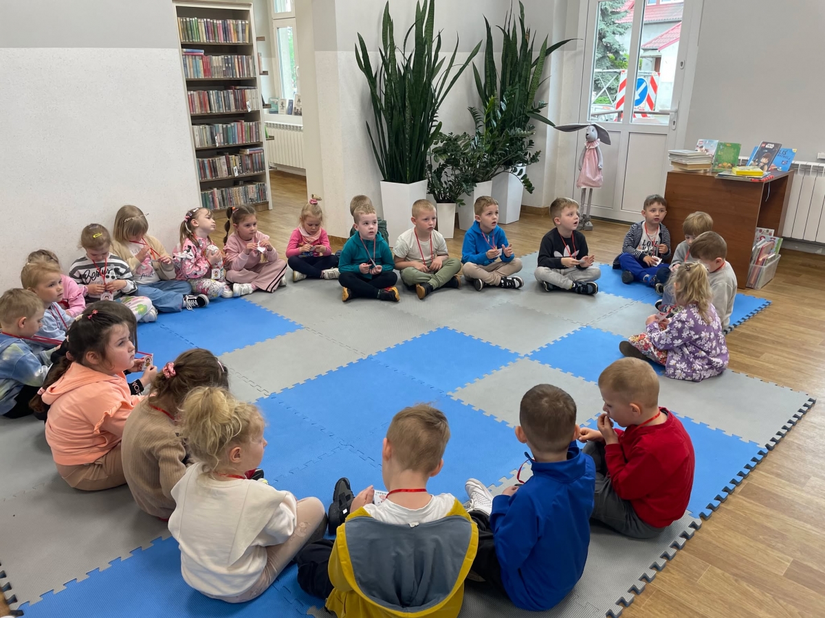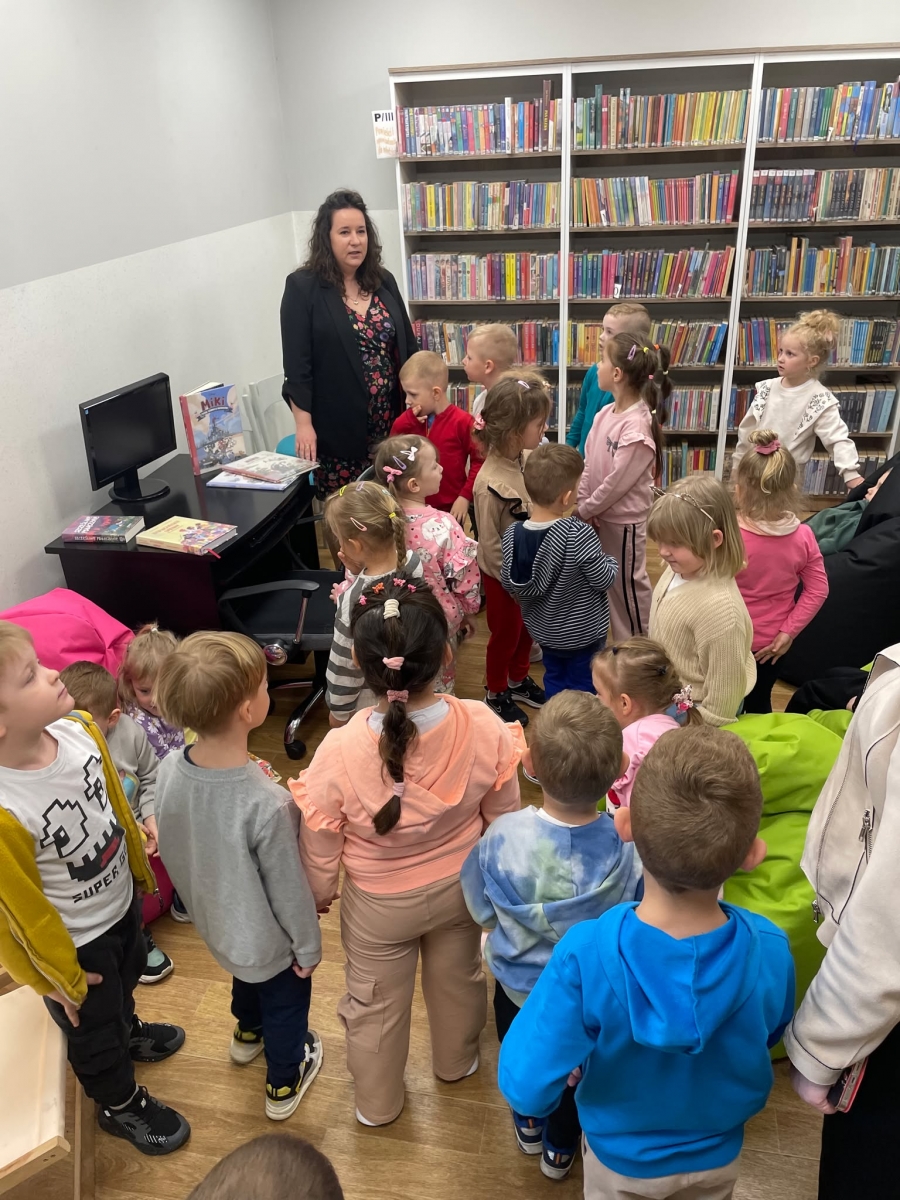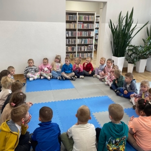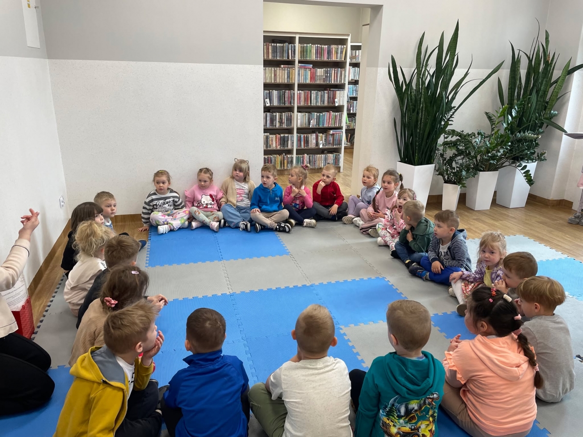 Była to pierwsza przedszkolna wizyta dzieci w naszej bibliotece. Rozmawialiśmy o książkach – o tym kto je pisze oraz jaki jest proces ich powstawania.