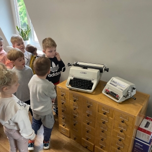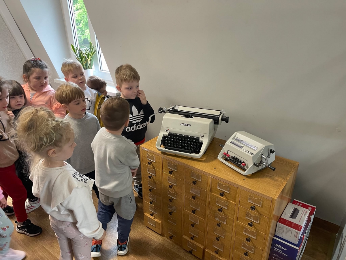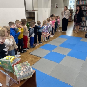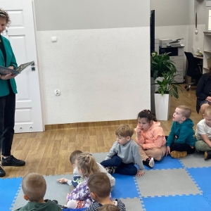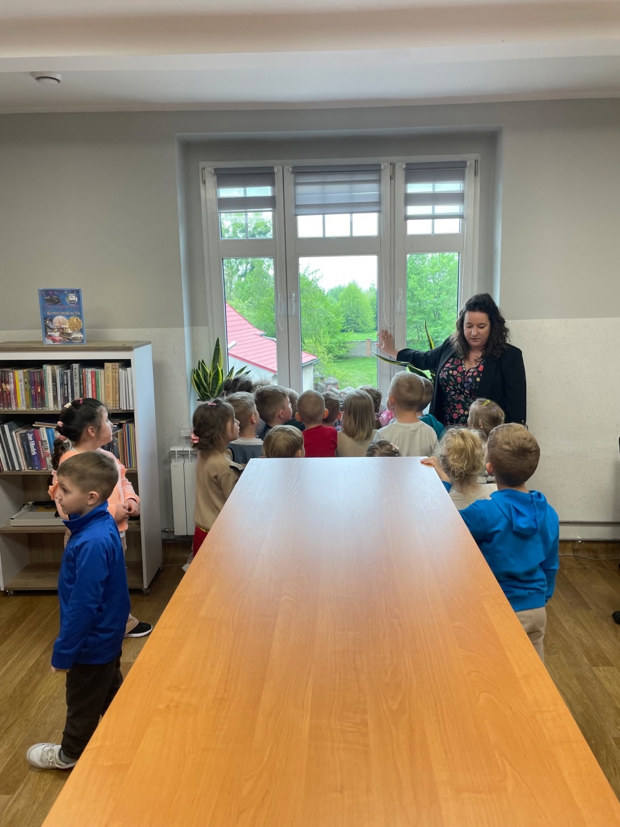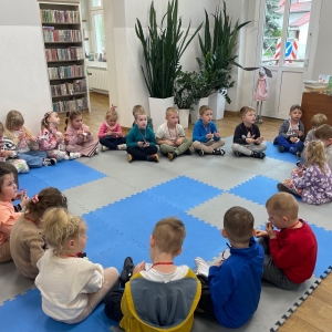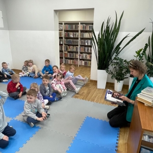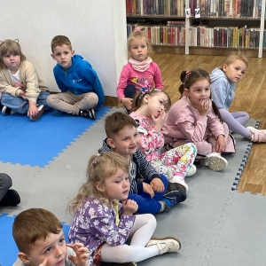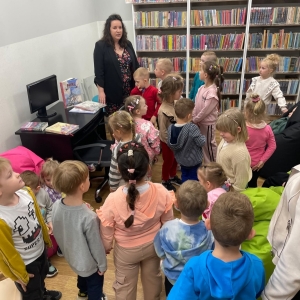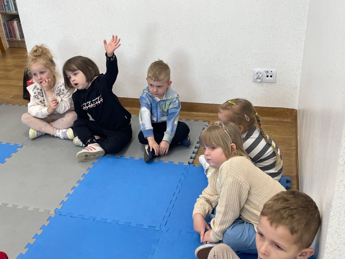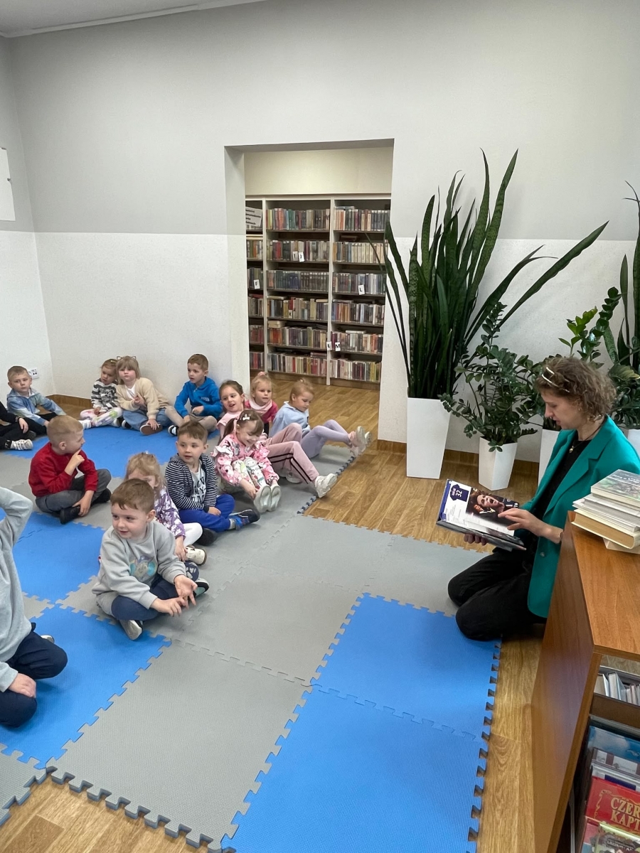 Była to pierwsza przedszkolna wizyta dzieci w naszej bibliotece. Rozmawialiśmy o książkach – o tym kto je pisze oraz jaki jest proces ich powstawania.