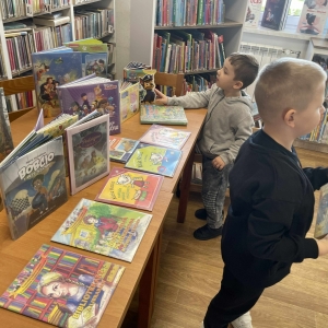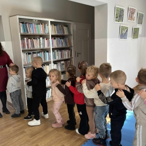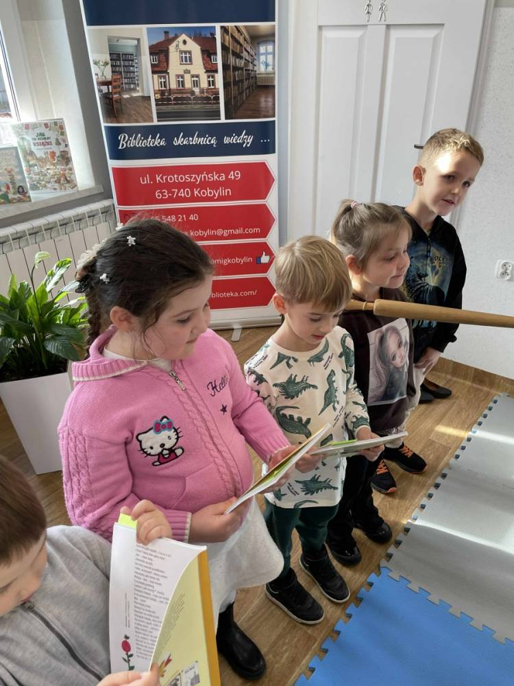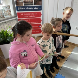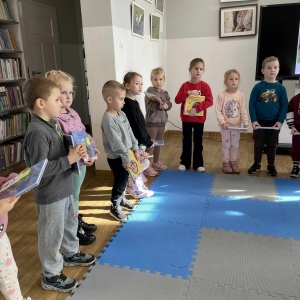 Galeria przedstawia 25 dzieci z grupy Jeżyki z Przedszkola w Kobylinie. Dzieci uczestniczą w spotkaniu w Bibliotece Publicznej. Dzieci słuchają bajki, która jest czytana. Uczestniczą w rozmowach na temat biblioteki i czytelnictwa. Dzieci zostały pasowane na czytelników Biblioteki Publicznej. Dzieci wypożyczyły po raz pierwszy samodzielnie książki według własnych upodobań.