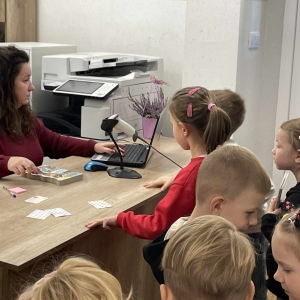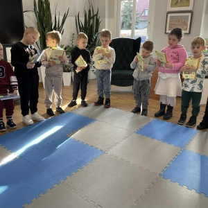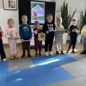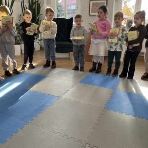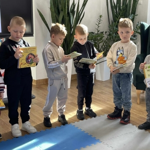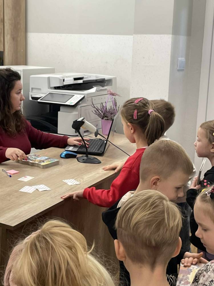 Najważniejszym punktem wizyty Jeżyków w książnicy było pasowanie na czytelnika. Każdy przedszkolak został pełnoprawnym użytkownikiem biblioteki. W nagrodę otrzymali upominki w postaci książek i kart na których będą zbierali naklejki przy każdej wizycie.