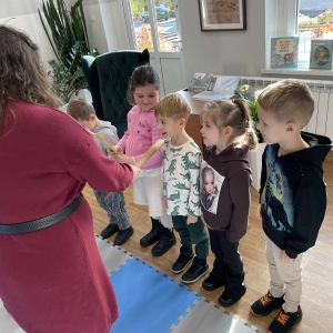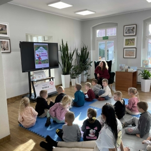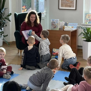 Spotkanie rozpoczęło się od głośnego czytania. Mali goście poznali bajkę ,,Łoś i biblioteka na kółkach” Ingii Moore. Ta wyjątkowa historia pokazuje jak ważne jest wspólne czytanie i jaka jest rola biblioteki w naszym życiu. We wtorkowy poranek nie zabrakło również rozmów z dziećmi o poszanowaniu książek.