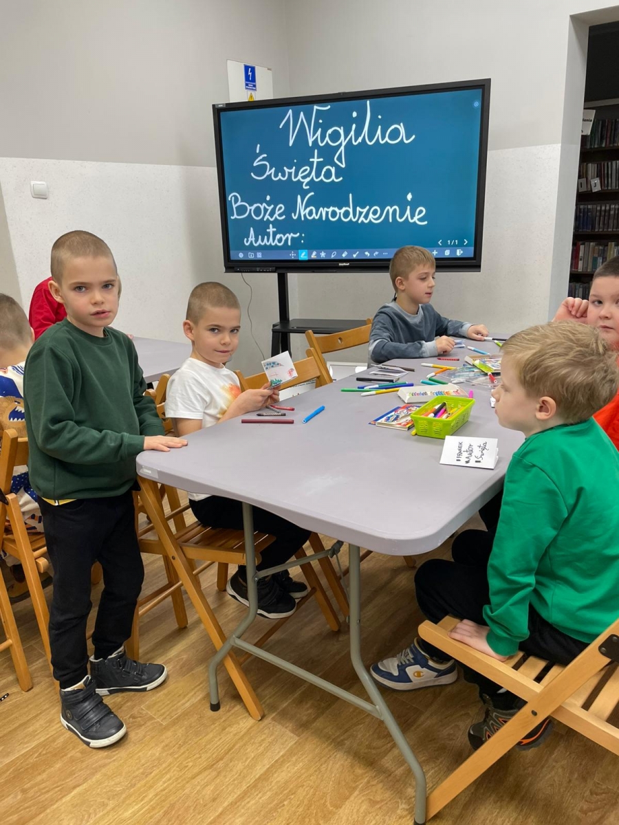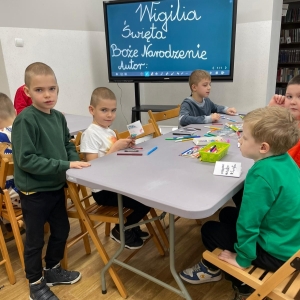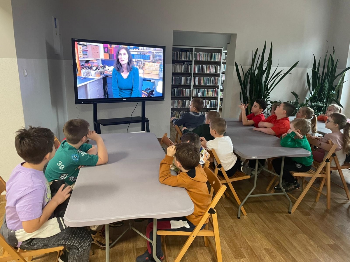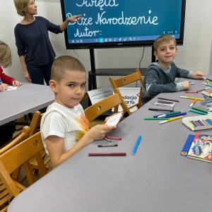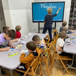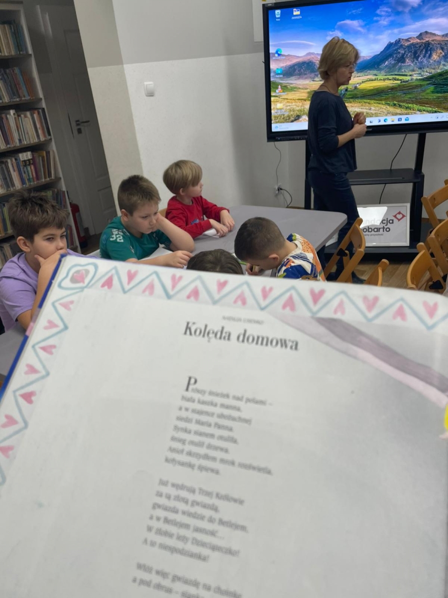 Uczniowie obejrzeli krótki filmik, udostępniony przez portal Uniwersytet Dzieci, w którym Pani ilustratorka zabrała nas wirtualnie do swojej pracowni i opowiedziała o swojej pracy. Następnie uczniowie otrzymali mini-książeczki i wysłuchali wierszyk o tematyce świątecznej.
