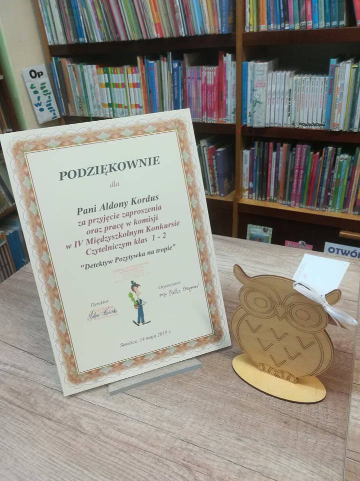 14 maja 2019 roku odbył się IV Międzyszkolny Konkurs Czytelniczy klas 1-2 ,,Detektyw Pozytywka na tropie". Organizatorem konkursu była Szkoła Podstawowa w Smolicach. Celem konkursu było rozwijanie zainteresowań czytelniczych. Odpowiedzi uczniów oceniały: Aldona Kordus - dyrektor Biblioteki Publicznej Miasta