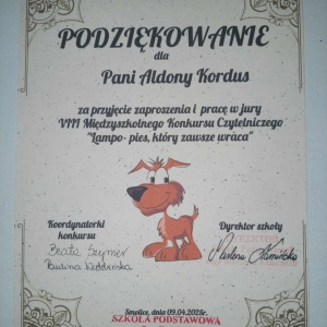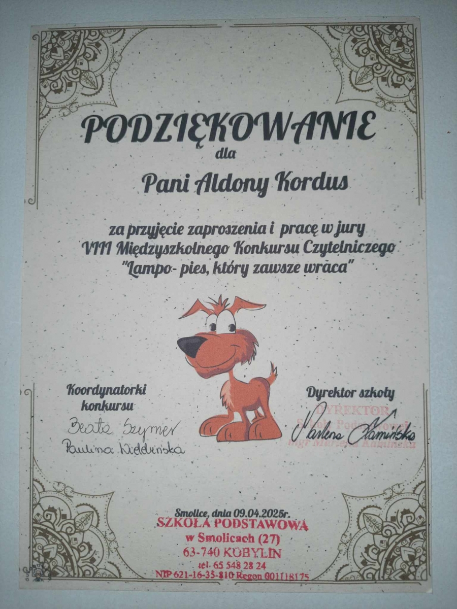 Serdecznie dziękuję koordynatorom konkursu Pani Beacie Szyrner i Pani Paulinie Wielebińskiej za zaproszenie, możliwość pracy w komisji konkursowej, a przede wszystkim za nieustanną współpracę między Biblioteką Publiczną i Szkołą Podstawową w Smolicach.
