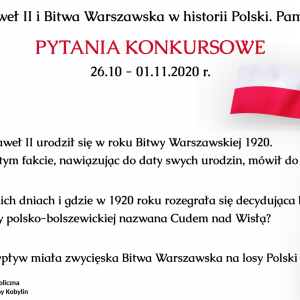 Dzisiaj rozpoczynamy nasz konkurs historyczny on-line „Jan Paweł II i Bitwa Warszawska w historii Polski. Pamiętamy” i tym samym udostępniamy 3 pytania konkursowe. Będą się one pojawiały cyklicznie w poniedziałki do 16 listopada (włącznie).