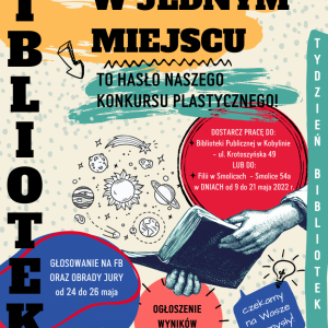 Zastanów się, co dla ciebie znaczy hasło: BIBLIOTEKA – ŚWIAT W JEDNYM MIEJSCU, a następnie przenieś to na papier! Format i technika pracy są dowolne. Zgłoszenia rozpoczynają się dziś i potrwają do 21 maja b.r. Regulamin i karta zgłoszeniowa do pobrania znajduje się poniżej. Prace konkursowe przyjmujemy w kobylińskiej książnicy (ul. Krotoszyńska 49) oraz w Filii Bibliotecznej w Smolicach (Smolice 54a).