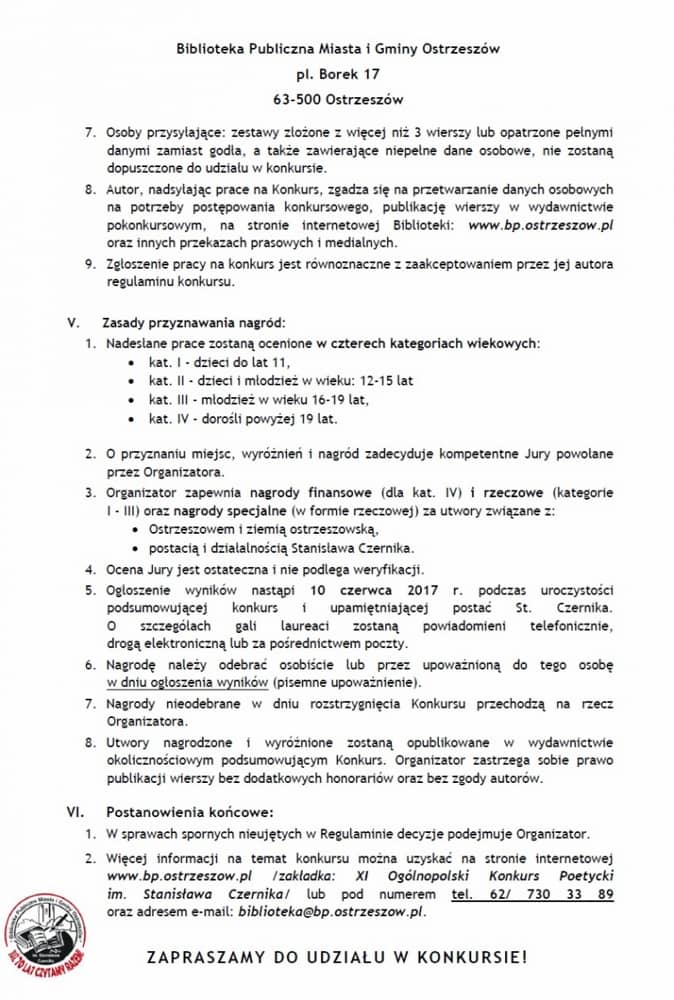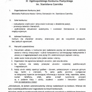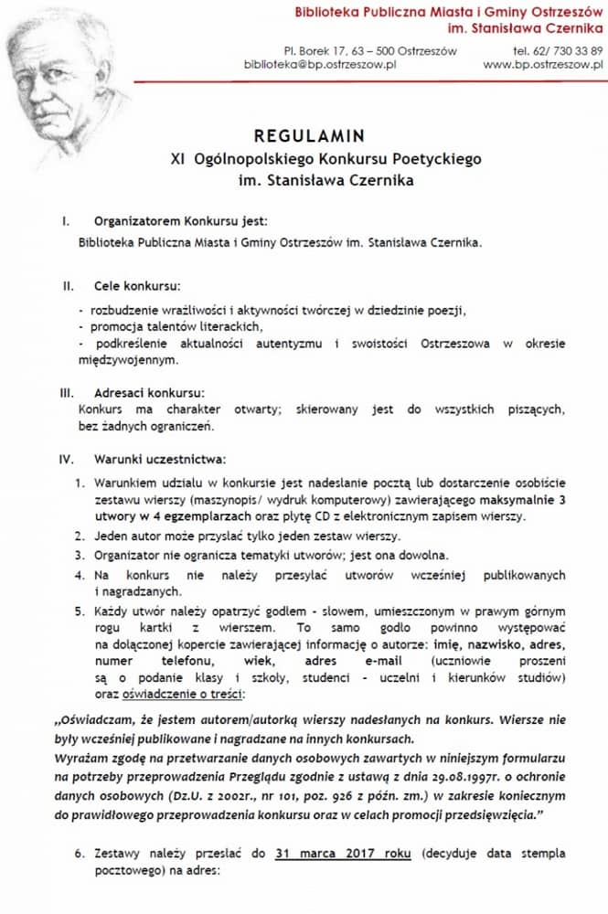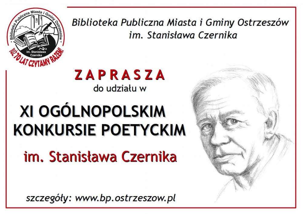 Zapraszamy do wzięcia udziału w XI Ogólnopolskim Konkursie Poetyckim im. Stanisława Czernika organizowanym przez Bibliotekę Publiczną Miasta i Gminy Ostrzeszów im. Stanisława Czernika.