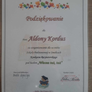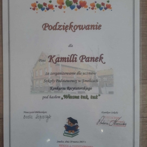 20 marca odbył się konkurs recytatorski „Wiosna tuż, tuż …” zorganizowany przez Filię Biblioteki Publicznej w Smolicach oraz bibliotekę Szkoły Podstawowej w Smolicach. Celem wydarzenia była popularyzacja poezji, rozbudzenie wrażliwości na jej piękno, kształtowanie języka, wyobraźni oraz promowanie talentów recytatorskich.