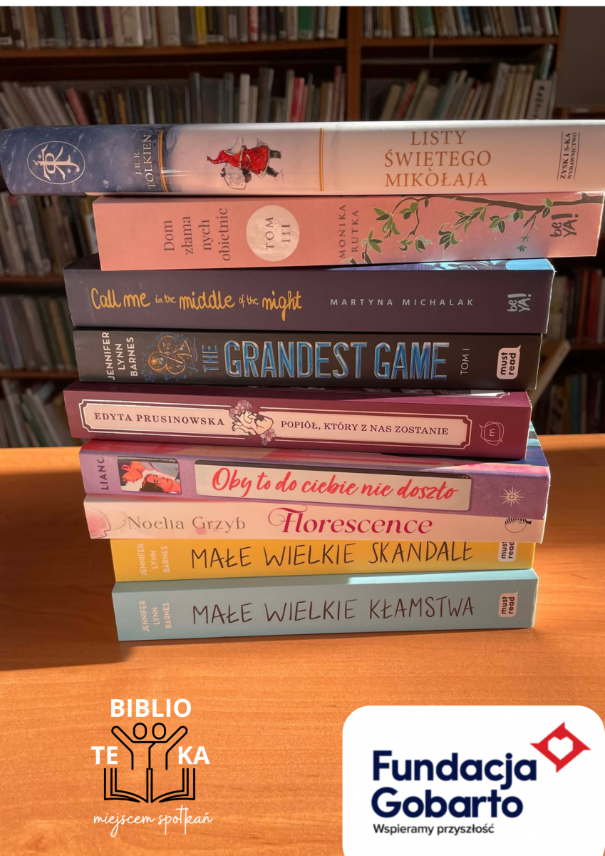 W ramach projektu BIBLIOTEKA MIEJSCEM SPOTKAŃ, dzięki IV edycji programu „Wspieramy Przyszłość” Fundacji Gobarto zakupiliśmy w grudniu 2025 r. książki skierowane do młodzieży. Zakupiono 19 książek na łączną kwotę 887,76 zł .