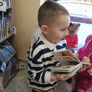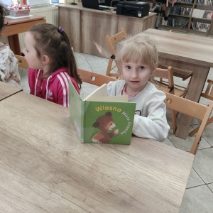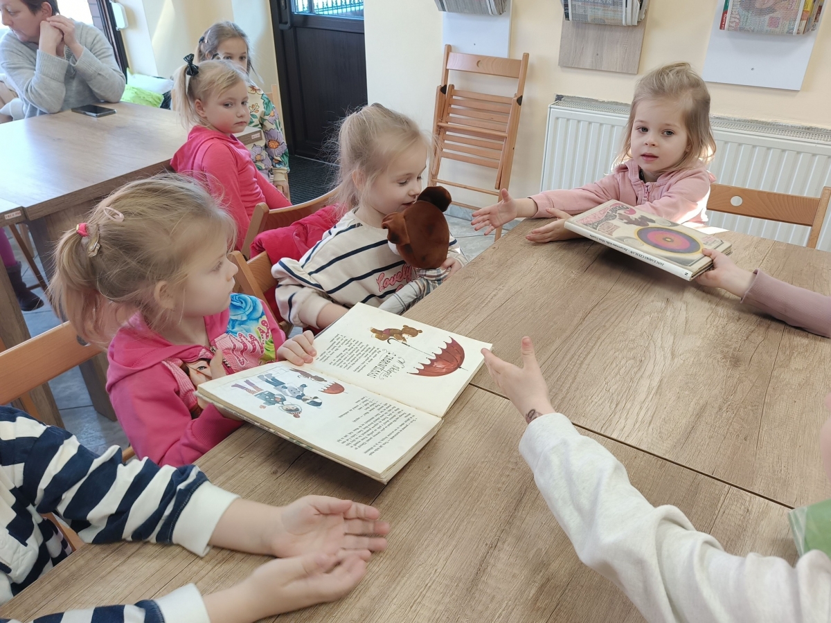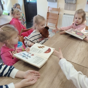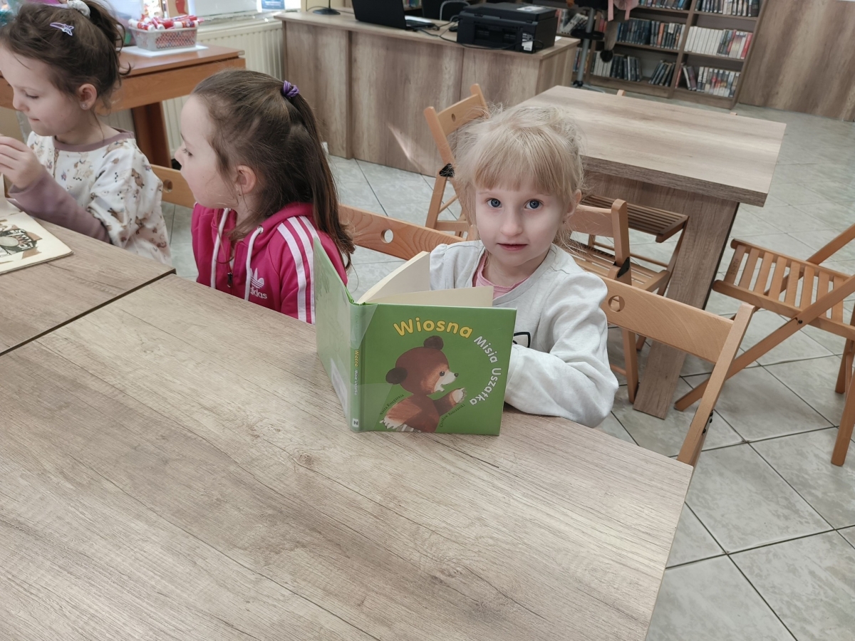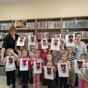 Bibliotekarka przeczytała obecnym fragment książki Czesława Janczarskiego „Wiosna Misia Uszatka” o perypetiach głównego bohatera. Uczestnicy zajęć dowiedzieli się również kilku ciekawostek o Uszatku: skąd wzięło się jego imię, jak to się stało, że uszko Misia oklapło, ile maskotek było potrzebnych do nagrania jednego odcinka serialu.