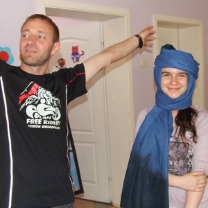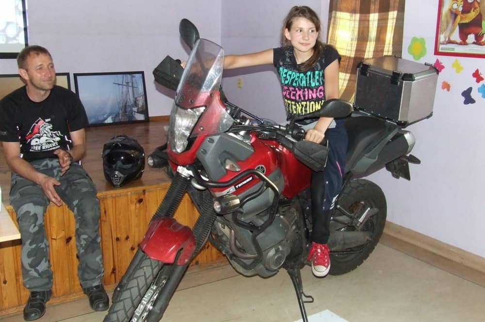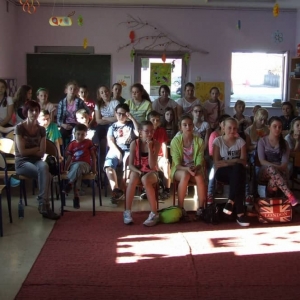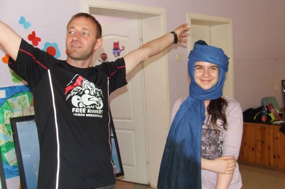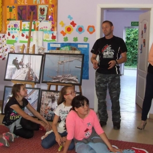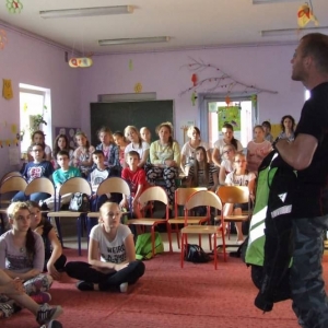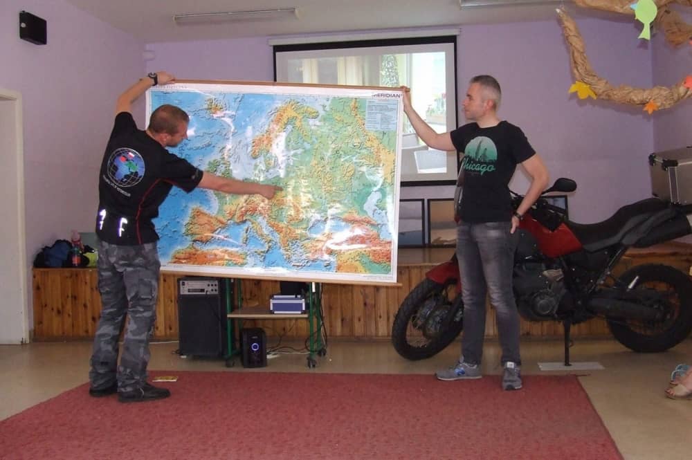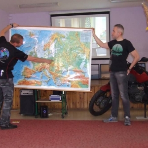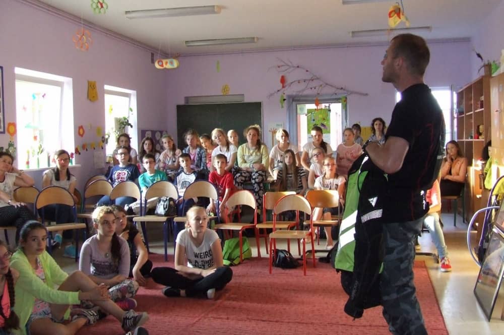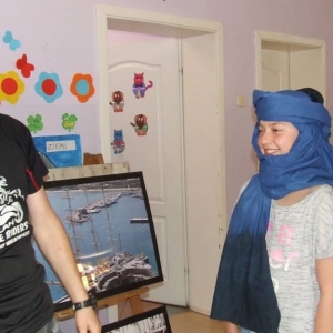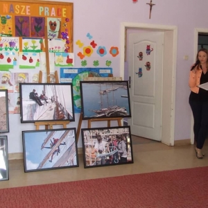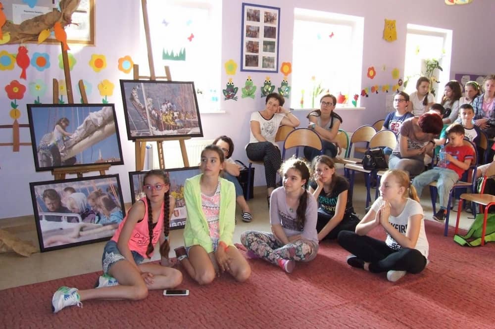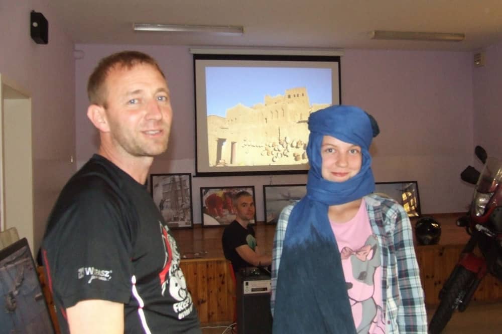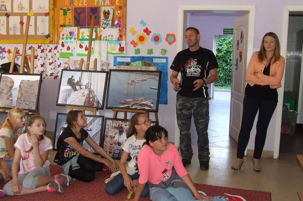 Pierwszym punktem programu było spotkanie z Panem Jackiem Łazarskim i Eweliną Niedobitek, które odbyło się w budynku Szkoły Podstawowej. Nasi goście specjalni opowiadali o rejsie polskim żaglowcem Pogoria. Dzięki opowieściom Pana Jacka przenieśliśmy się (w wyobraźni) do Maroko i na Karaiby. Każde dziecko mogło przymierzyć turban, który nasz podróżnik nosił podczas wypraw. Wszyscy uczestnicy spotkania mieli możliwość zrobienia zdjęcia z kobylińskim podróżnikiem oraz z jego motocyklem, którym przemierzał Saharę.