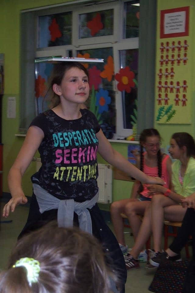 Wyścig z książką na głowie był kolejną konkurencją, która wzbudziła wiele emocji. Dzieci musiały pokonać trasę wyścigu w taki sposób, aby książka nie spadła z głowy. Najlepszy czas uzyskała Kamila Ignasiak – 12,13 s. , drugie miejsce zajęła Agata Kwiatkiewicz z czasem 14,20 s. , trzecie miejsce zajęła Natalia Spruta – 14,36 s. Gratulujemy !