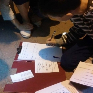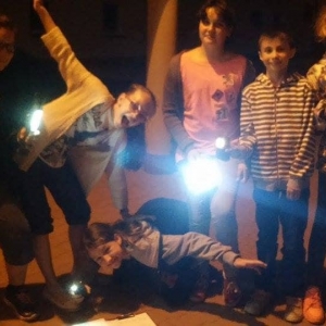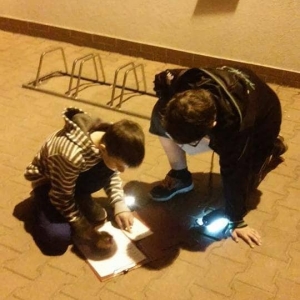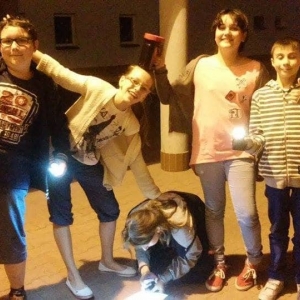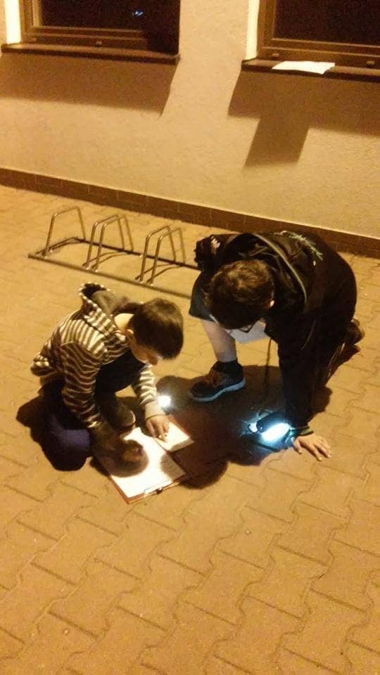 Ostatnią atrakcją były ,,Literackie podchody”. Dzieci zostały podzielone na cztery grupy. Aby wyjść w teren, szukać zagadek, musiały odgadnąć nazwy przypraw. Nie było to łatwe zadanie, lecz wszyscy sobie z nim poradzili. Następnie każda grupa losowała miejsce, w którym będzie szukała zagadek. Trzeba przyznać, iż nie było łatwo odkryć wszystkie łamigłówki, które były ukryte w rynnie, czy przyklejone do parapetu. Mrok wieczoru nie pomagał, ale dzieci zaopatrzone w latarki i z dobrym nastawieniem świetnie dały sobie radę. Mając wszystkie zagadki, do których dołączone były puzzle z fragmentami „Legendy o założeniu trzech miast: Kobylin, Jutrosin, Dubin” dzieci udały się do budynku Biblioteki Publicznej. Tam każda drużyna przedstawiła swój fragment legendy w postaci krótkiego teatrzyku. Uczestnicy zaprezentowali również rymowanki o ,,Nocy Bibliotek”. Na zakończenie podchodów wszyscy otrzymali kubek z wizerunkiem Kaczora Donalda. J