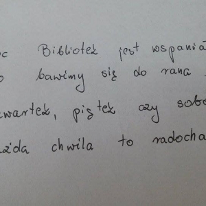 Gdy zbliżał się koniec naszego spotkania przenieśliśmy się z powrotem do budynku Szkoły Podstawowej, gdzie rodzice odebrali swoje zmęczone, ale szczęśliwe dzieci. Wszyscy zgodnie zadeklarowali swój udział w przyszłorocznej Nocy Bibliotek.