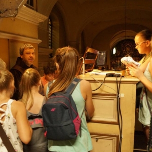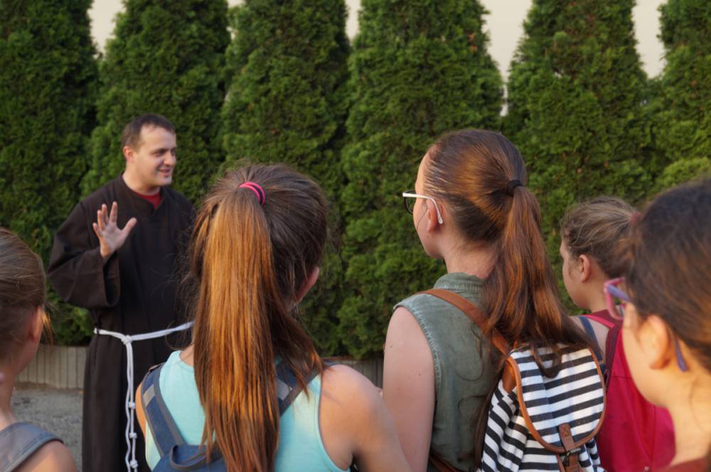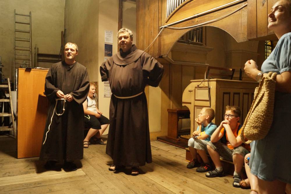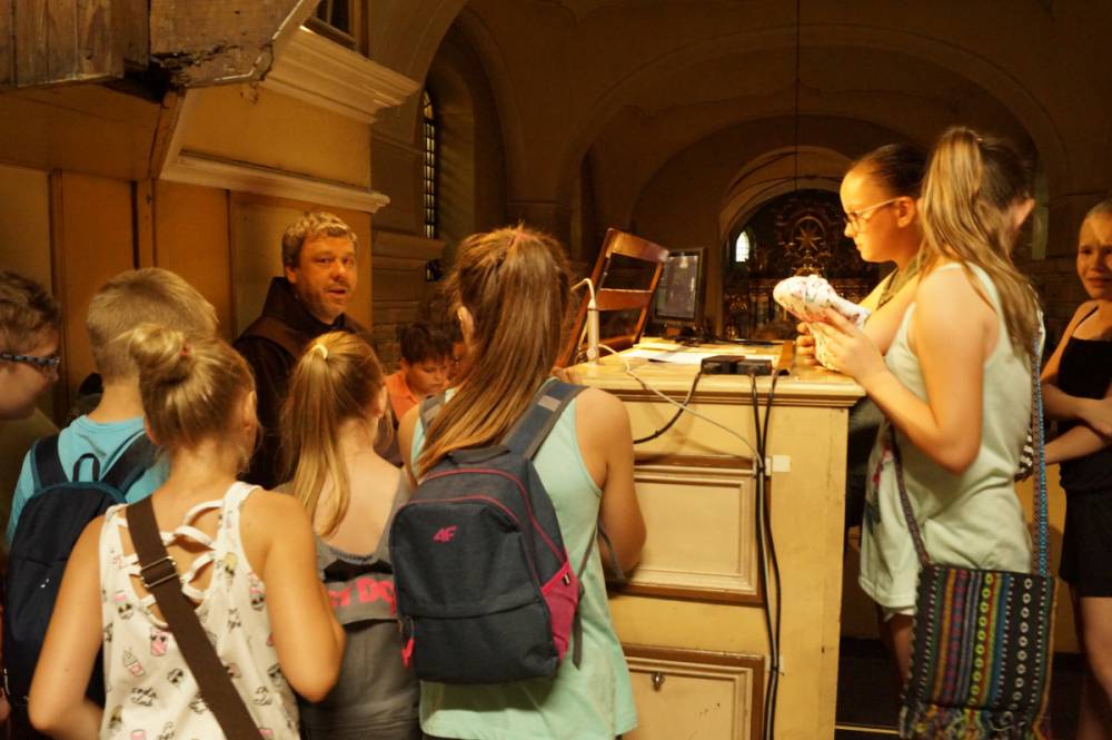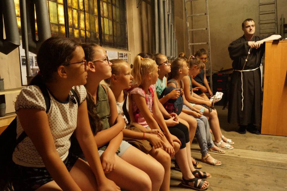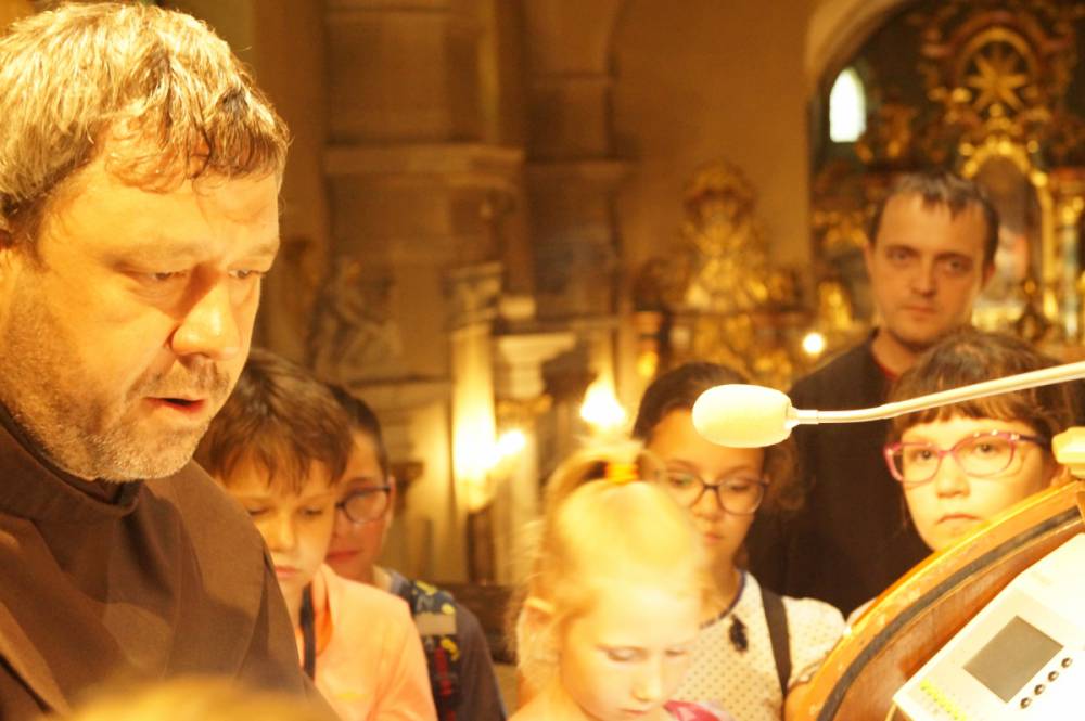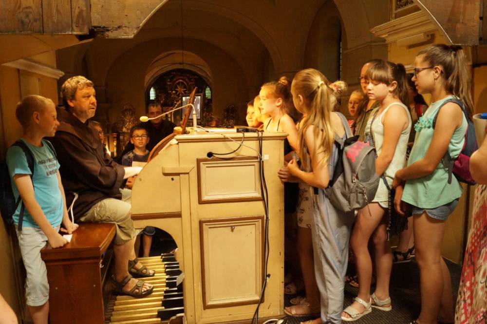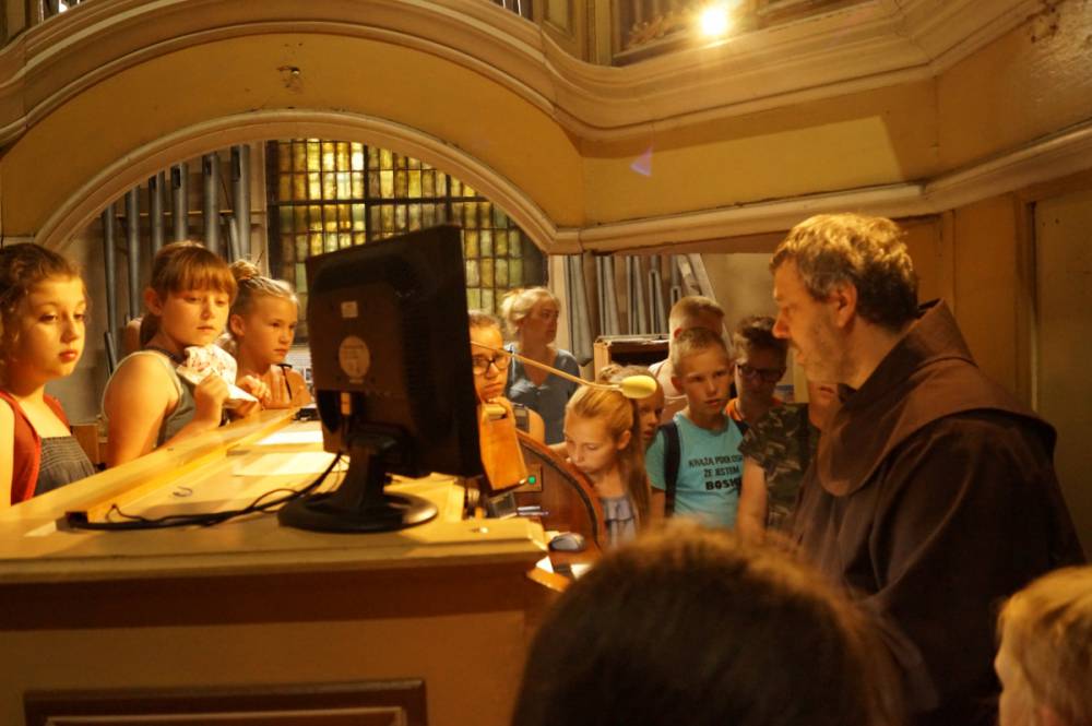 Pełni entuzjazmu wyruszyliśmy w dalszą drogę. Tym razem do Klasztoru Ojców Franciszkanów. Przywitał nas Ojciec Masseo, który oprowadził nas po obiekcie. Ojciec Ksawery zaprezentował klasztorne organy i dał mini koncert. Młodzież nie była dłużna… młode chórzystki ze Smolic pięknie zaśpiewały.