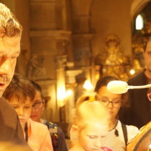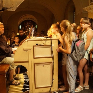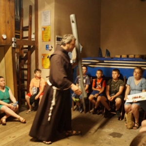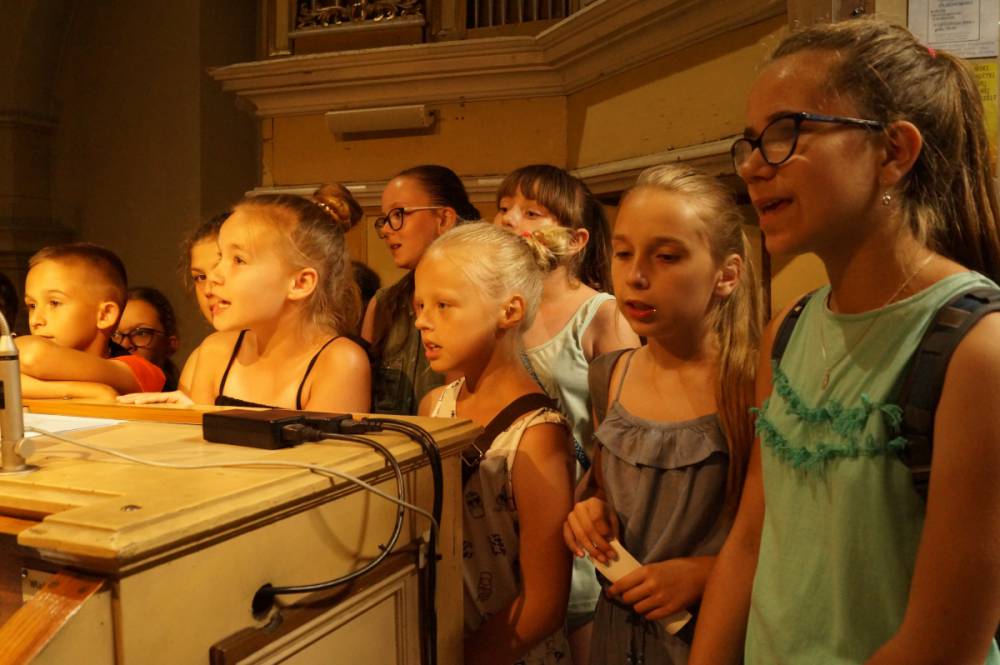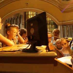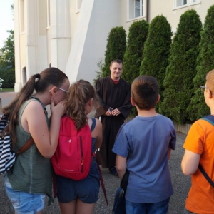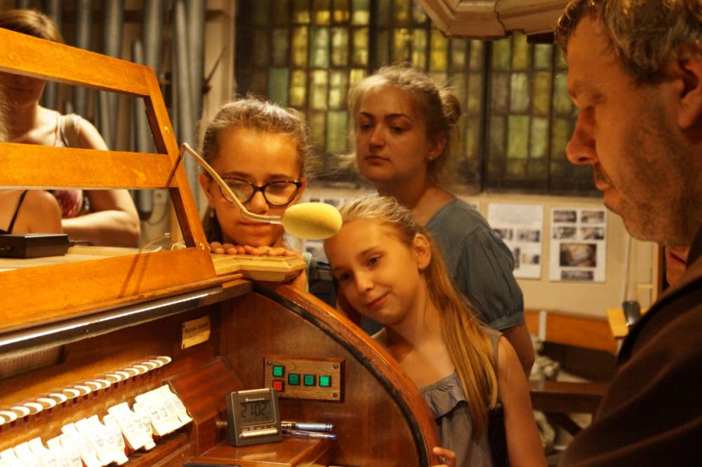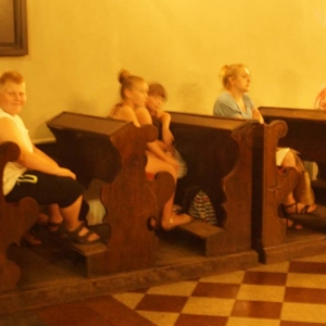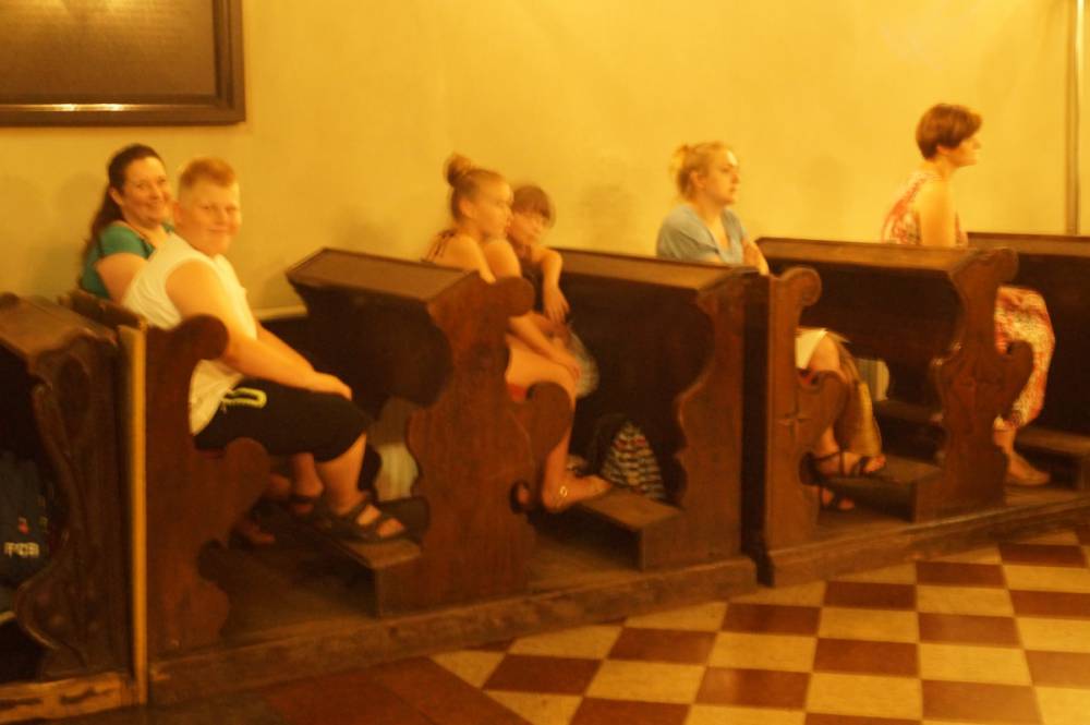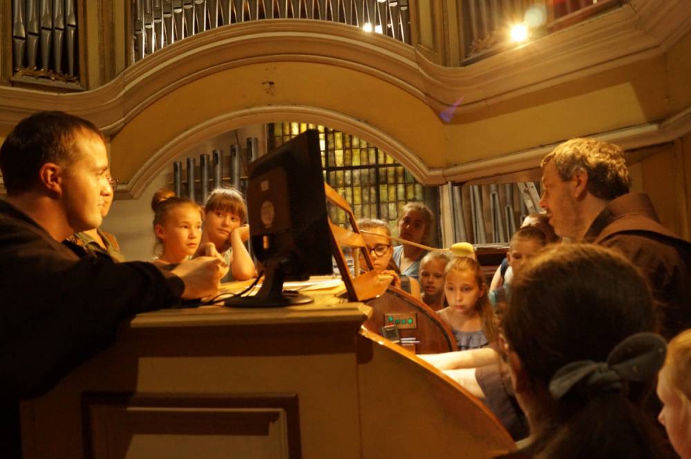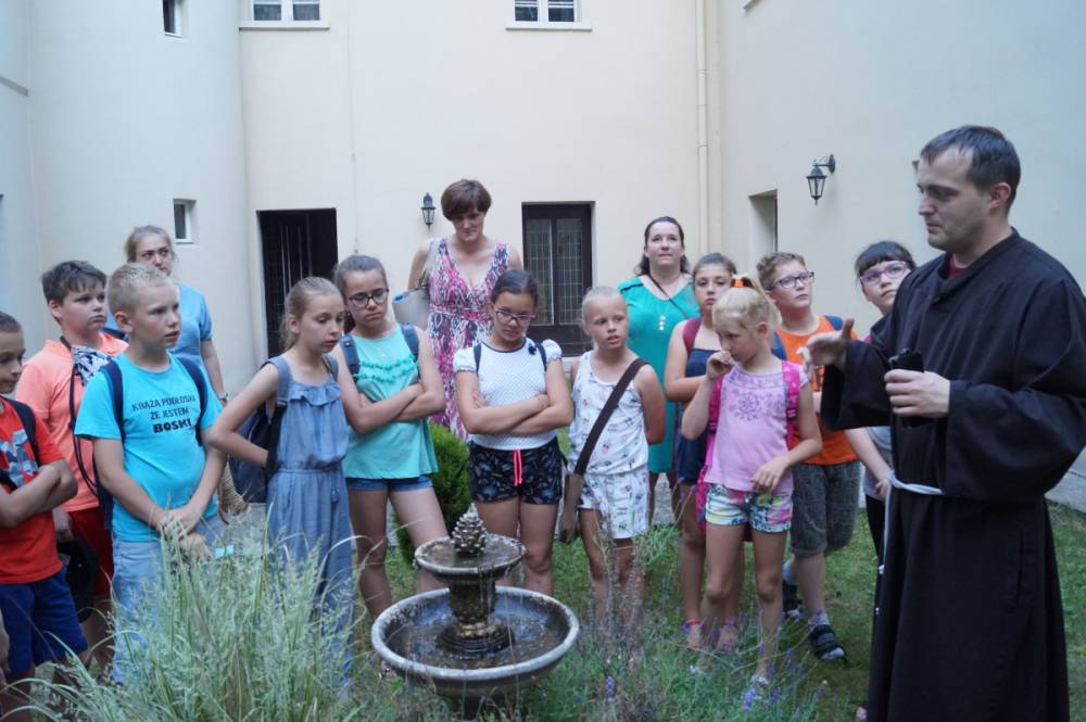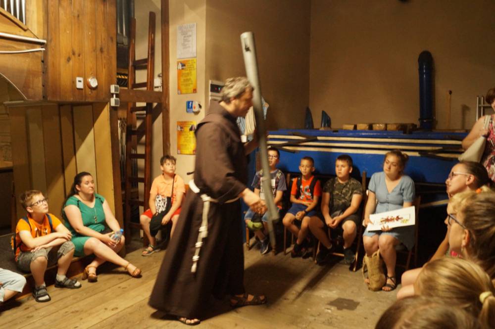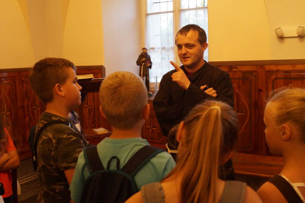 Pełni entuzjazmu wyruszyliśmy w dalszą drogę. Tym razem do Klasztoru Ojców Franciszkanów. Przywitał nas Ojciec Masseo, który oprowadził nas po obiekcie. Ojciec Ksawery zaprezentował klasztorne organy i dał mini koncert. Młodzież nie była dłużna… młode chórzystki ze Smolic pięknie zaśpiewały.