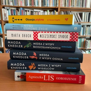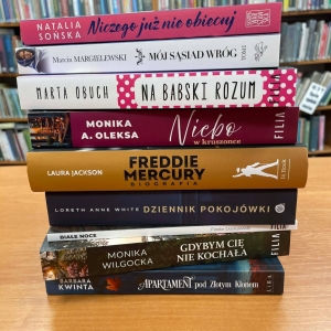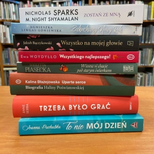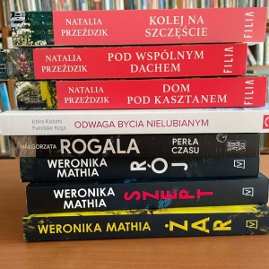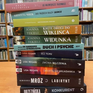 Galeria zawiera zdjęcia grzbietów książek i części okładek z ich tytułami dostępnych do wypożyczenia w kobylińskiej bibliotece.