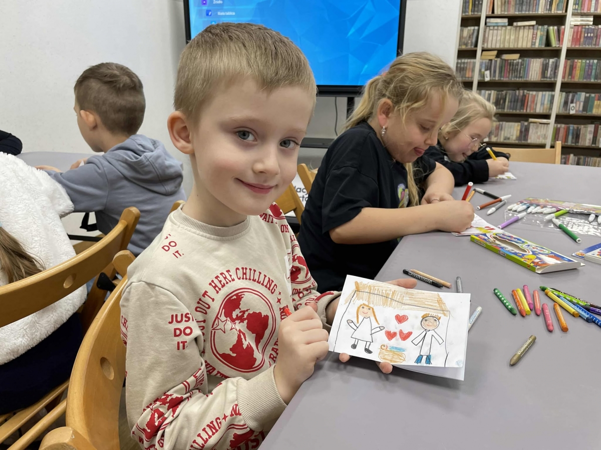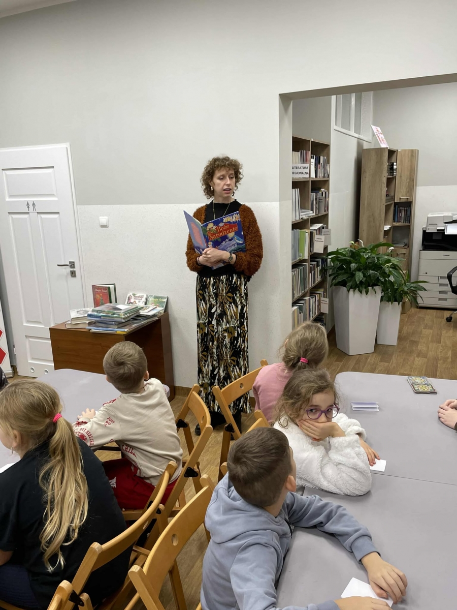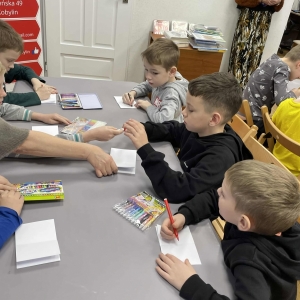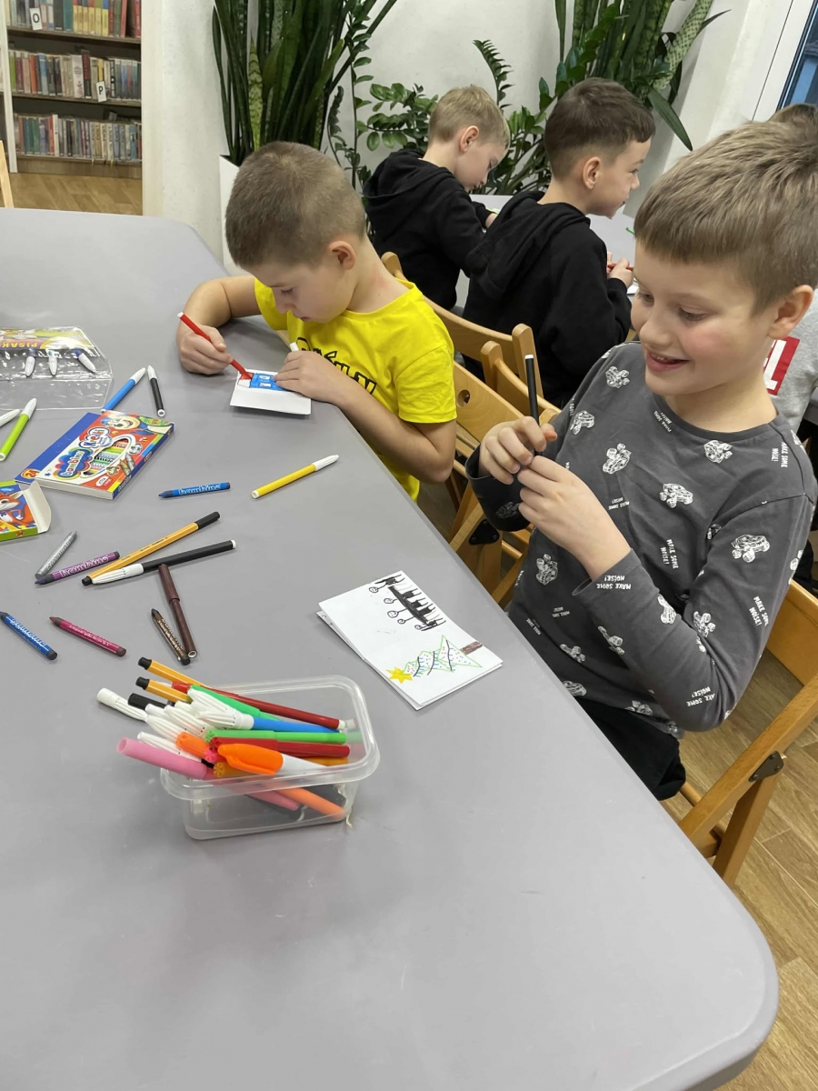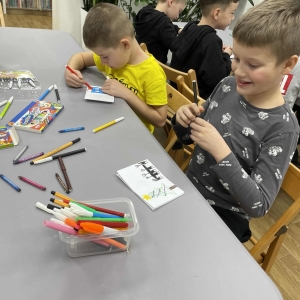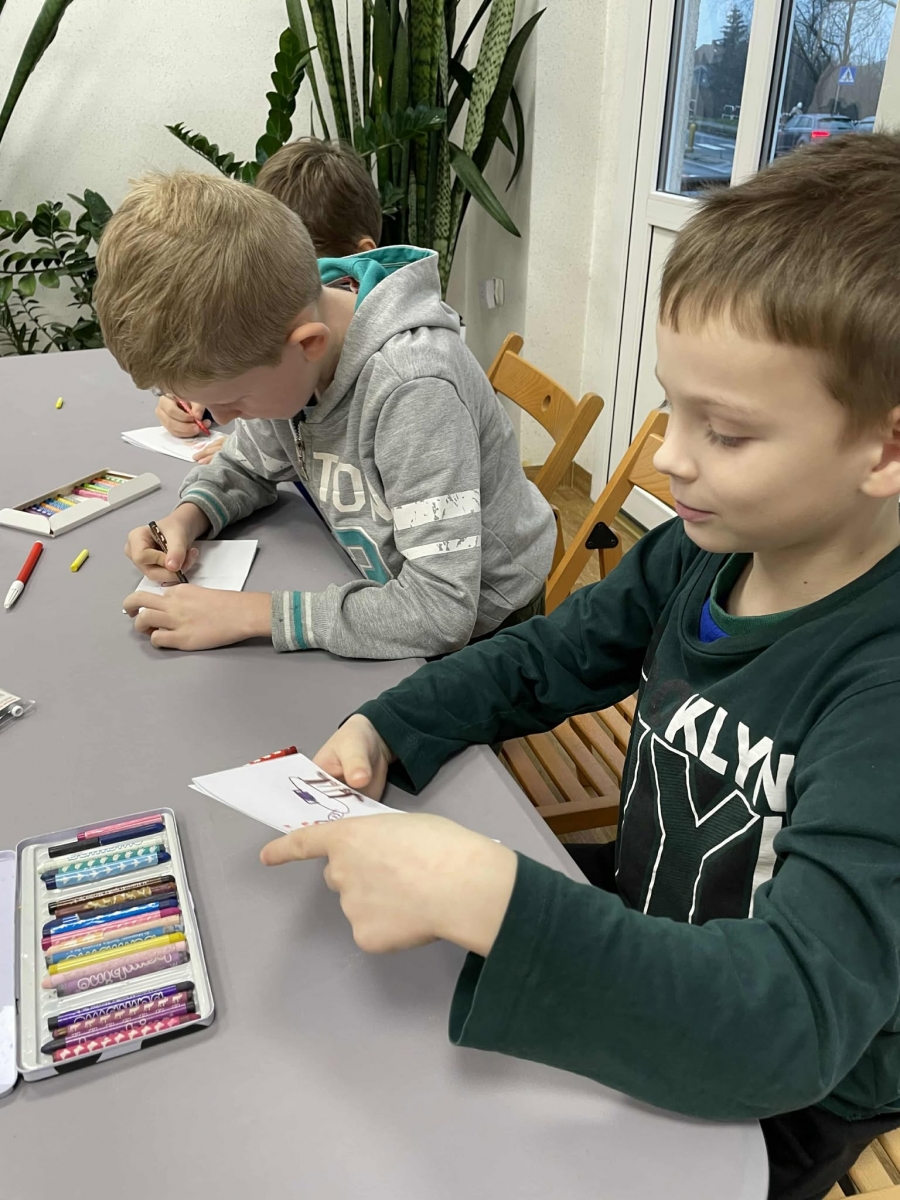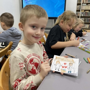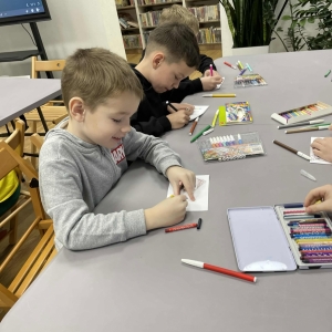 Po długich rozmowach przyszedł czas na część kreatywną. Uczniowie obejrzeli krótki filmik, udostępniony przez portal Uniwersytet Dzieci, w którym Pani ilustratorka zabrała nas wirtualnie do swojej pracowni i opowiedziała o swojej pracy. Następnie uczniowie otrzymali mini-książeczki i wysłuchali wierszyk o tematyce świątecznej.