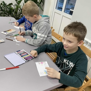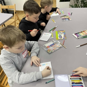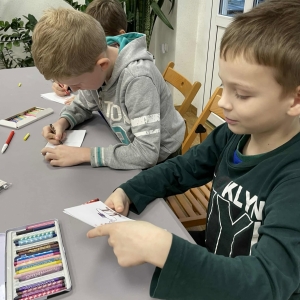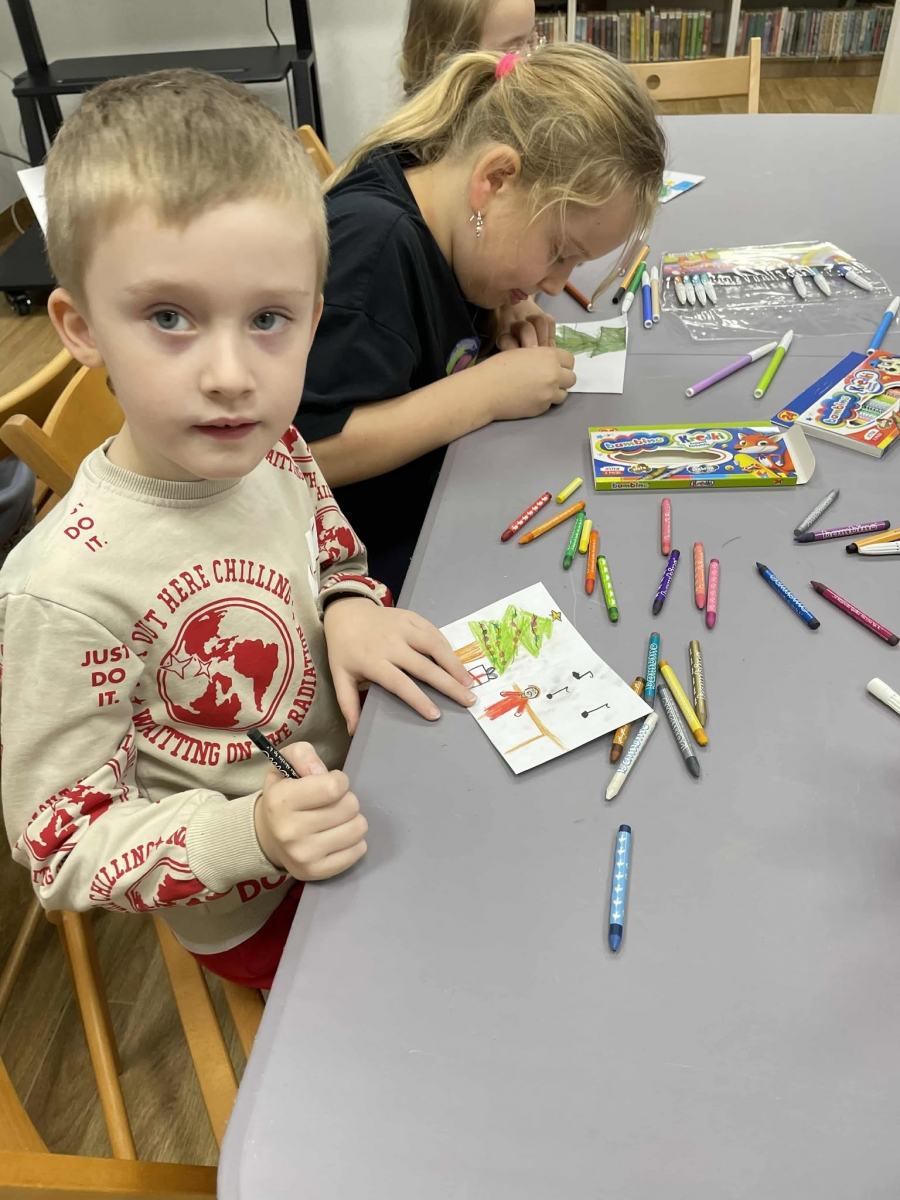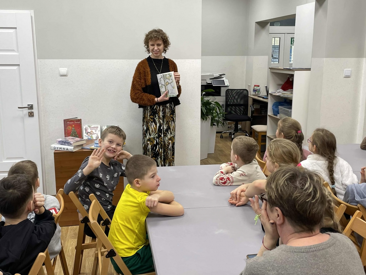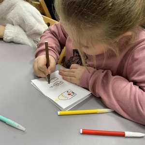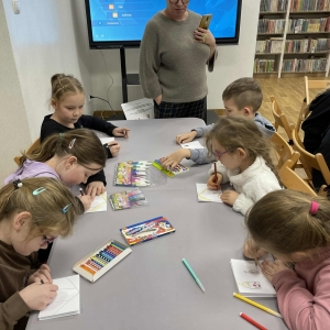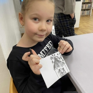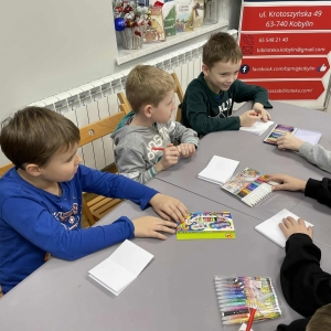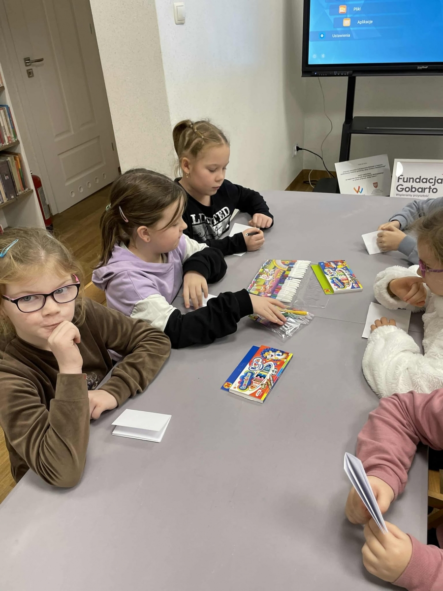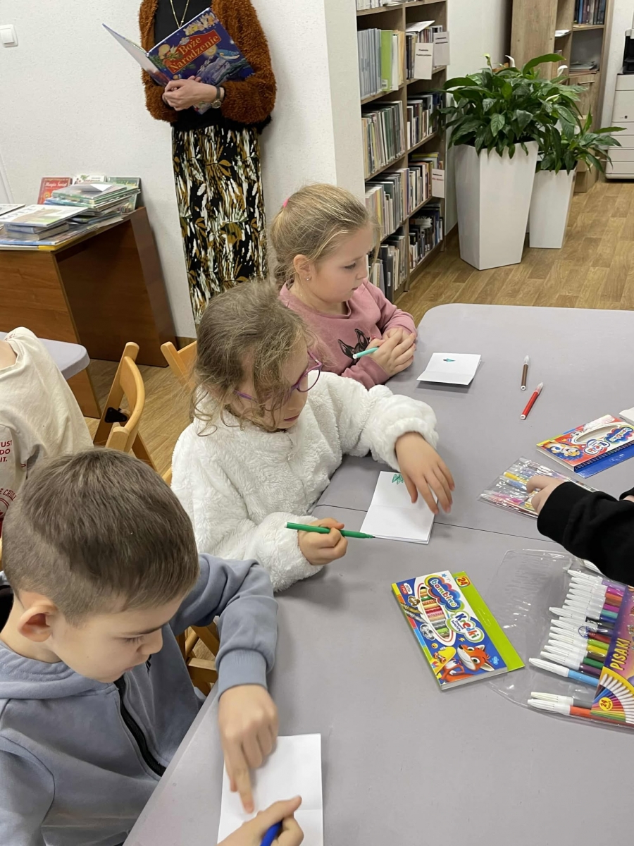 Po długich rozmowach przyszedł czas na część kreatywną. Uczniowie obejrzeli krótki filmik, udostępniony przez portal Uniwersytet Dzieci, w którym Pani ilustratorka zabrała nas wirtualnie do swojej pracowni i opowiedziała o swojej pracy. Następnie uczniowie otrzymali mini-książeczki i wysłuchali wierszyk o tematyce świątecznej.