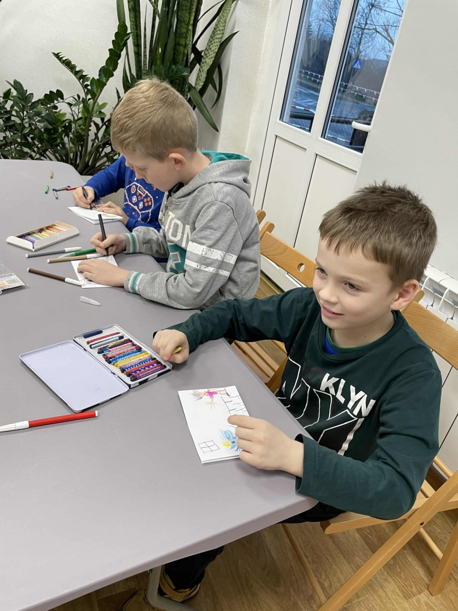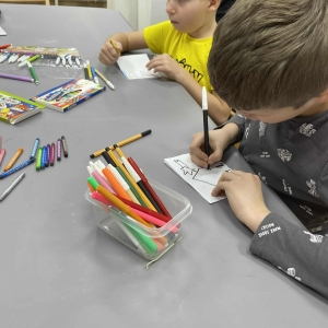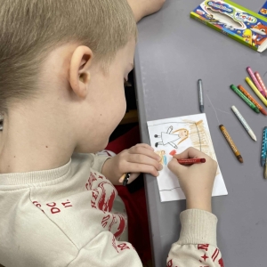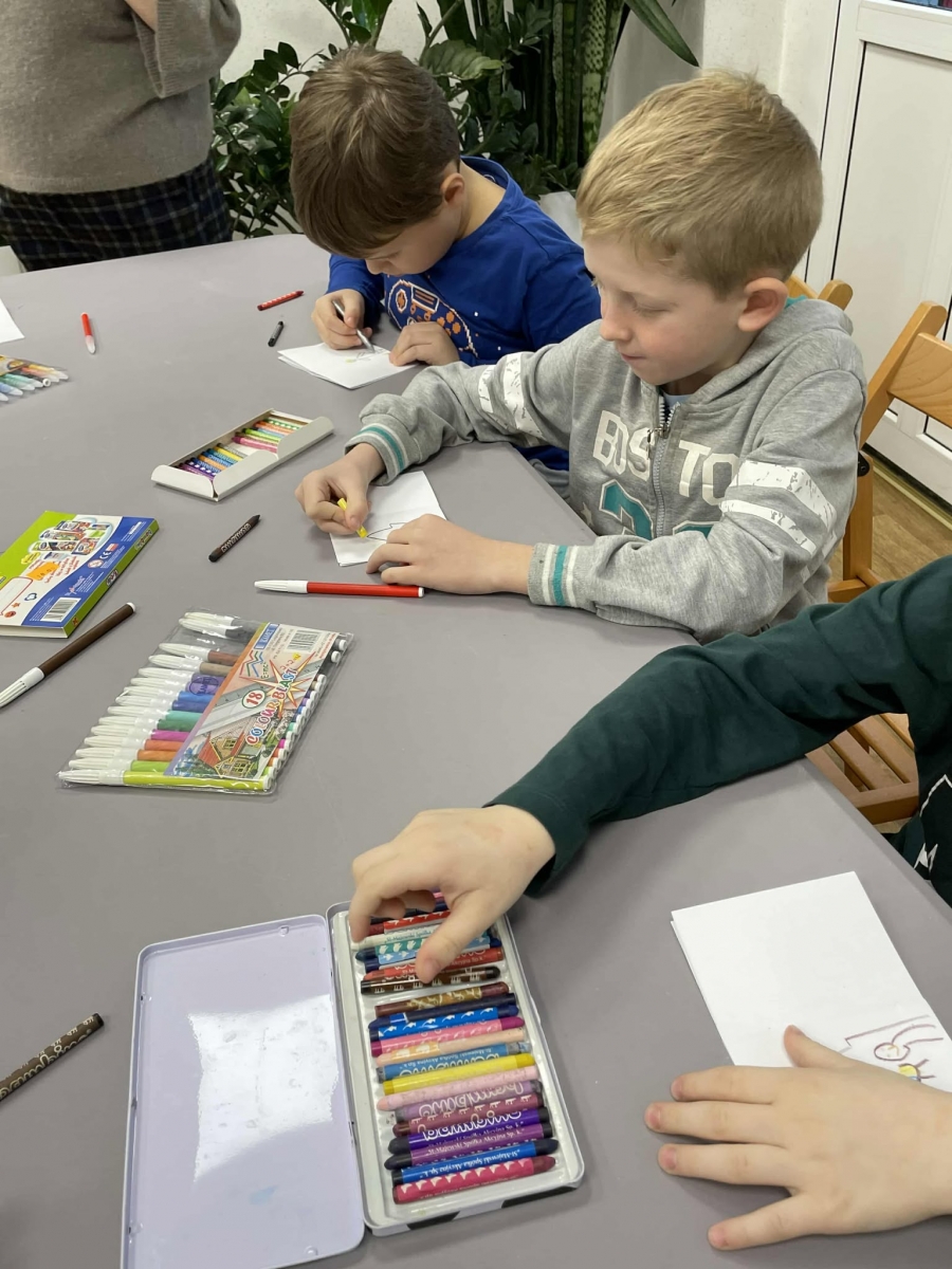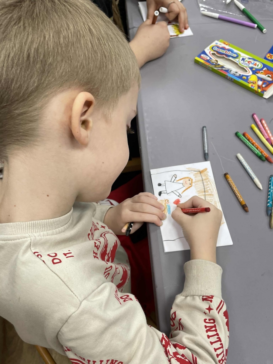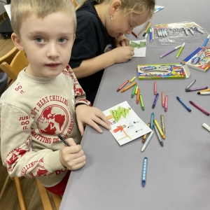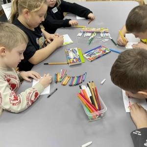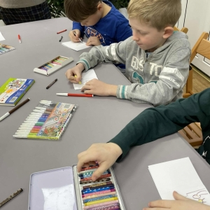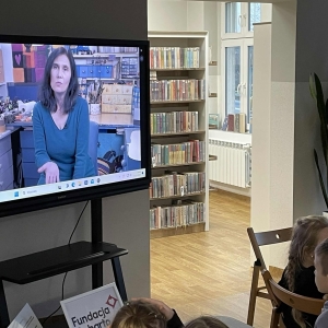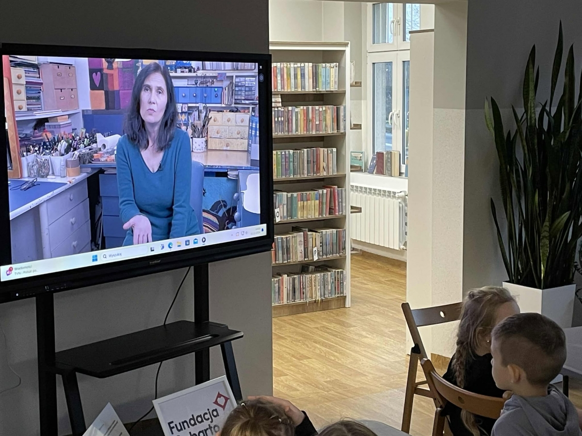 Po długich rozmowach przyszedł czas na część kreatywną. Uczniowie obejrzeli krótki filmik, udostępniony przez portal Uniwersytet Dzieci, w którym Pani ilustratorka zabrała nas wirtualnie do swojej pracowni i opowiedziała o swojej pracy. Następnie uczniowie otrzymali mini-książeczki i wysłuchali wierszyk o tematyce świątecznej.