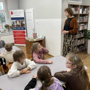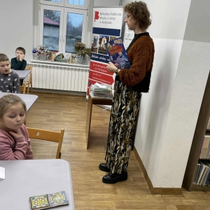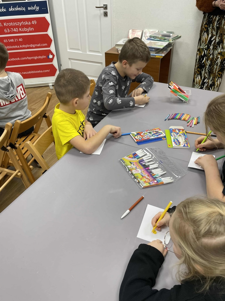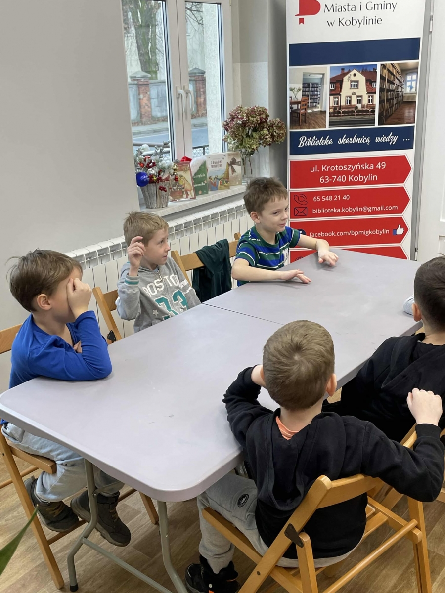 Spotkanie rozpoczęliśmy od tematu książek oraz księgozbioru kobylińskiej książnicy. Dzieci z nie lada zdumieniem przyjęły informację, że księgozbiór naszej biblioteki liczy ponad 20 tysięcy pozycji! Mówiliśmy także o tym jak powstaje książka. Uczniowie dowiedzieli się, że rodzi się ona z pomysłu osoby, którą nazywamy pisarzem. Następnie trafia do wydawnictwa, gdzie pracuje nad nią kilka osób. Ostatnim etapem jest drukarnia, gdzie powstaje fizycznie. Dopiero wtedy gotowa książka trafia na półkę księgarni, skąd biblioteka może zakupić ją do swojego księgozbioru. Czytelnicy natomiast, przychodząc do książnicy, mogą ją wypożyczyć.