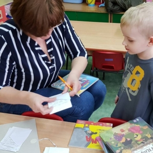 Na zakończenie spotkania starszaki wypożyczyły kolejną porcję książek do czytania w domu.