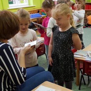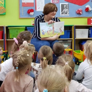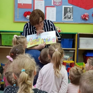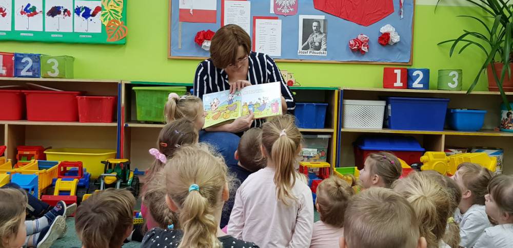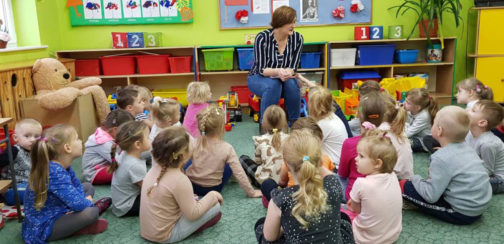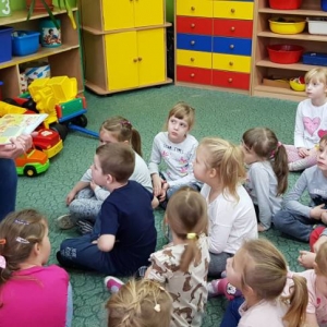 Podczas wizyty, dzieci wysłuchały bajki „ Jak krówka Stokrotka nauczyła się szanować przyrodę”. Dzięki lekturze, przedszkolacy dowiedzieli się jak ważne jest dbanie o przyrodę, segregowanie śmieci. Najmłodsi opowiadali również w jaki sposób oni szanują naturę.
