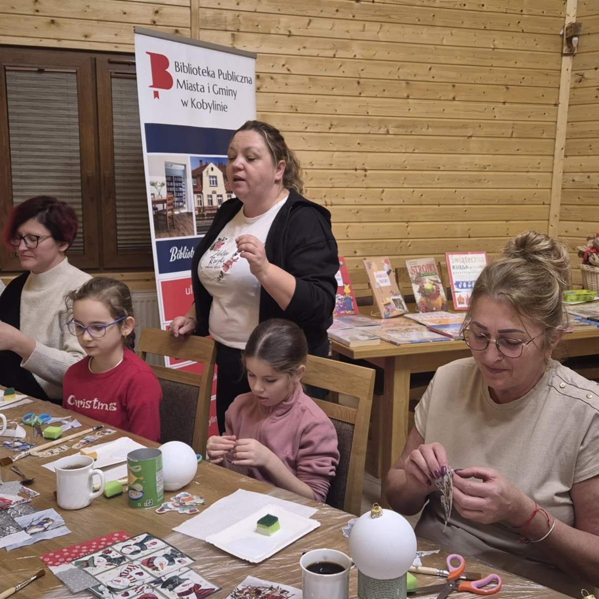 W galerii znajdują się zdjęcia z wydarzenia Objazdowa Biblioteka w Długołęce , które odbyło się 10 grudnia 2025 r. Na zdjęciach widać osoby dorosłe i dzieci, które tworzą bobmbki metodą decoupage. WIdać też dzieci, które oglądają, czytają książki oraz piszą listy do Mikołaja.