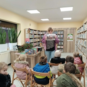Galeria przedstawia zdjęcia z wizyty przedszkolaków w Filii Bibliotecznej w Smolicach. Na zdjęciach bibliotekarka pokazuje dziecciom ilustracje. Jedno zdjęcie przedstawia okładkę książki. Kolejne, to zdjęcie grupowe.