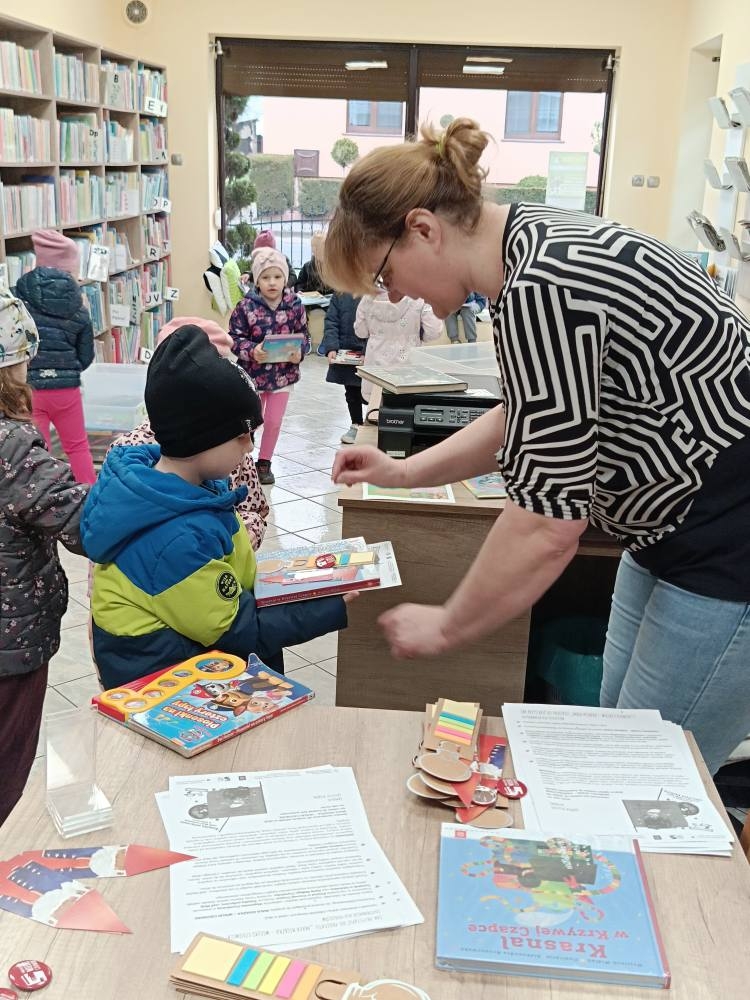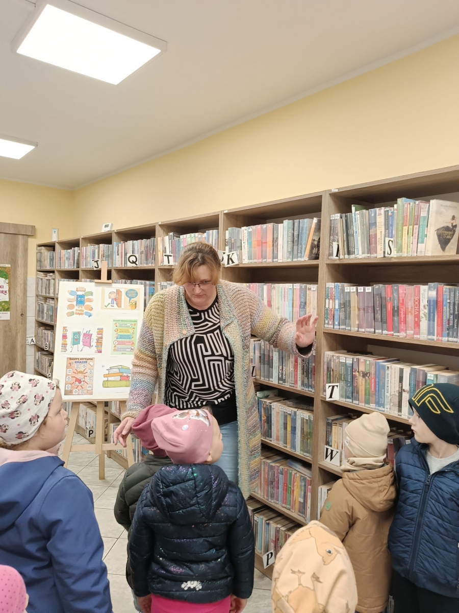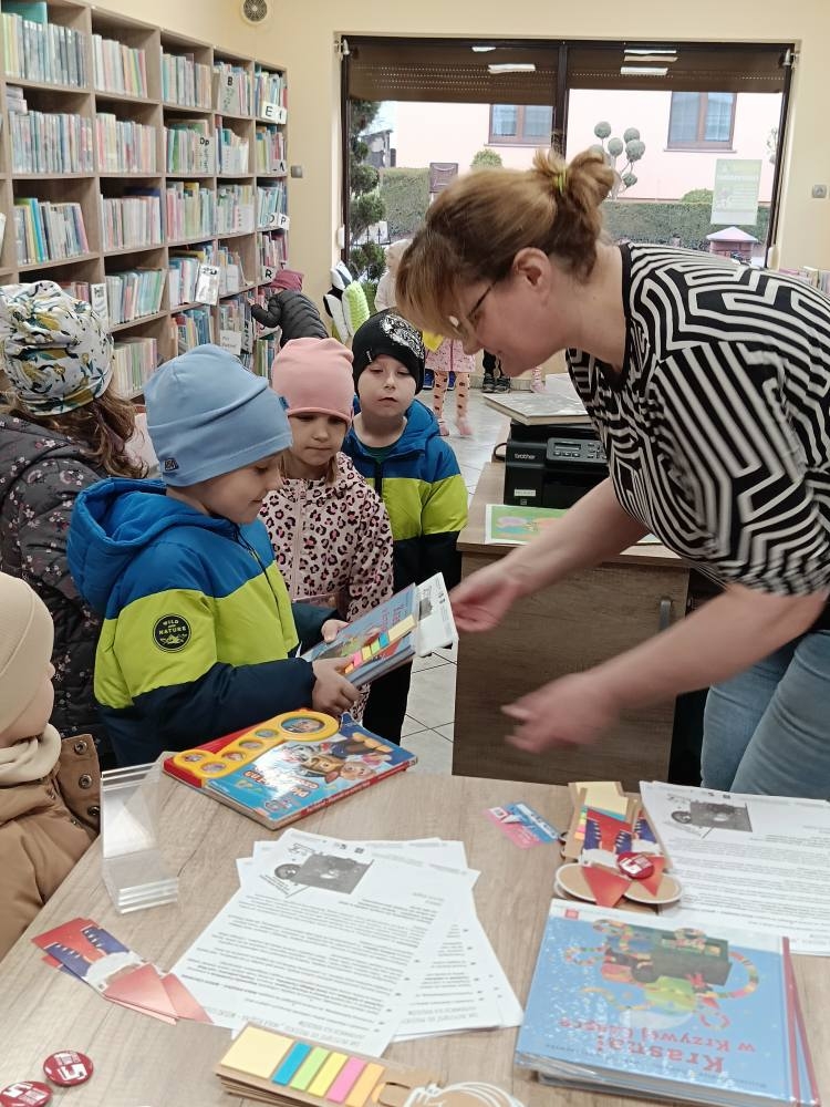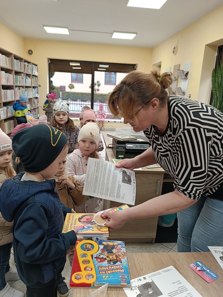 Młodzi czytelnicy dowiedzieli się co to jest biblioteka, jakie książki się w niej znajdują. Wspólnie z bibliotekarką uzgodnili, jak należy dbać o książki, co wolno, a czego nie powinno się robić czytając lekturę. Z zainteresowaniem wysłuchali baśni H. Ch. Andersena pt.: „Kogut podwórzowy i kogucik na dachu”.