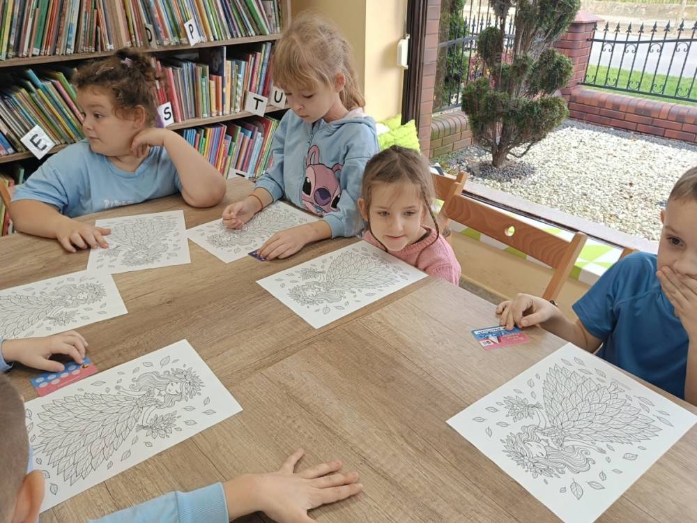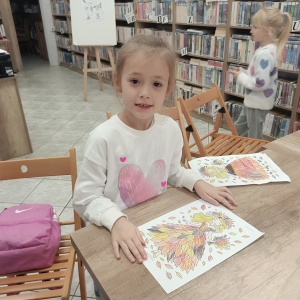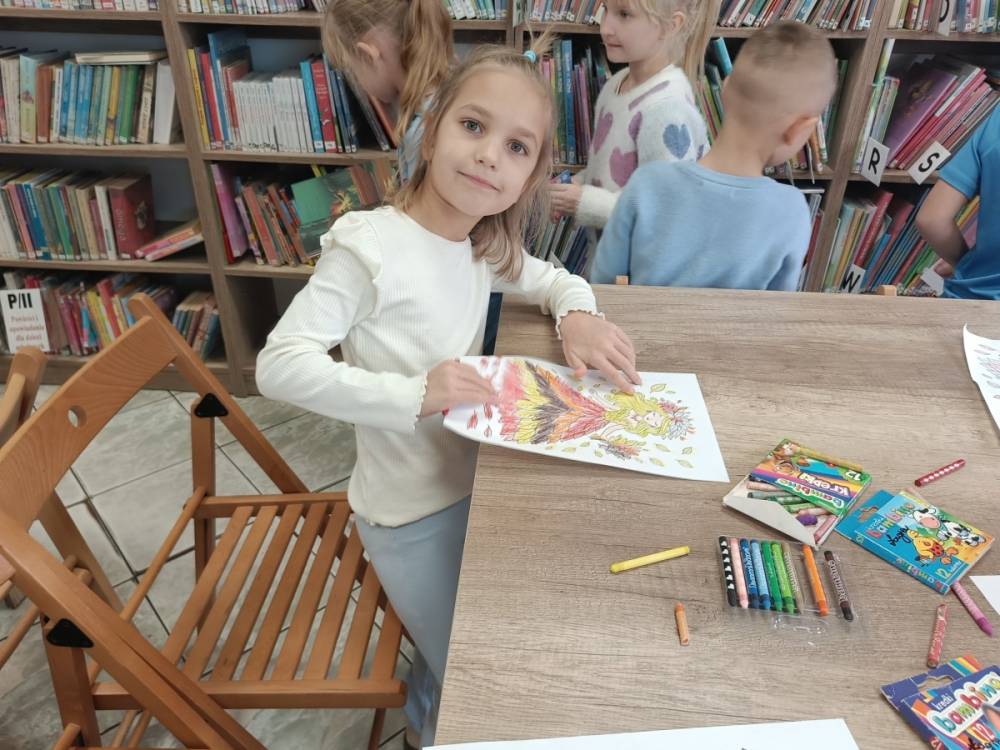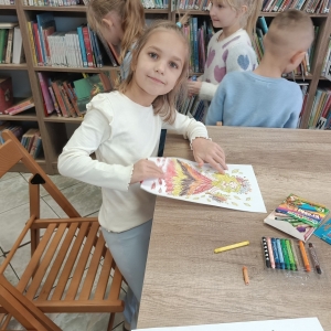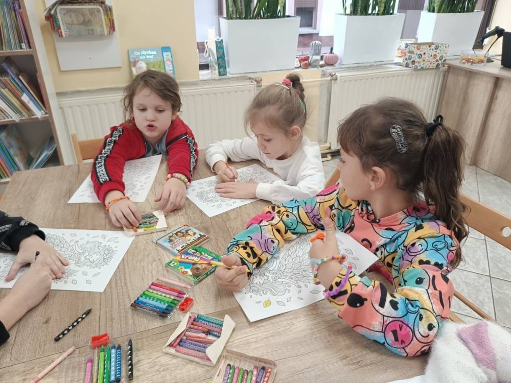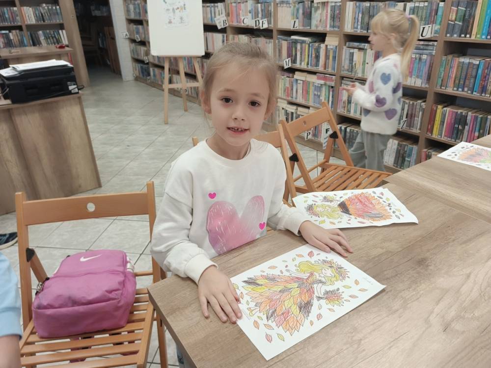 Tematem spotkania była jesień. Młodzi czytelnicy wyrazili swoje zdanie, czym dla nich jest jesień. Dowiedzieli się, czy jest potrzebna i co oznacza w przyrodzie. Wspólnie wymienili owoce jesieni, tak potrzebne zwierzętom, przygotowującym się na nadejście zimy. Młodzi adepci czytelnictwa rozwiązali również quiz oraz wysłuchali wiersza Marii Konopnickiej pt.: „Jesienią”. Bibliotekarka odczytała zebranym list od Pani Jesieni z prośbą o pomoc w znalezieniu kolorów i ozdobieniu jej sukni. Dzieci chętnie spełniły prośbę, pięknie ją kolorując.