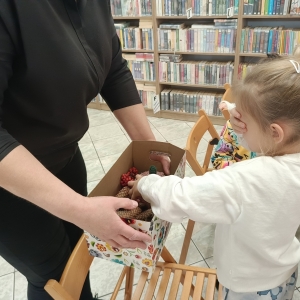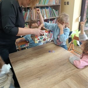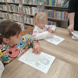 Galeria zawiera zdjęcia z odwiedziny przedszolaków w bibliotece. Dzieci losują z pudełka owoce jesieni. Koloruja obrazek z Panią Jesienią. Pozują do zdjęcia z bibliotekarką na tle półek z książkami.