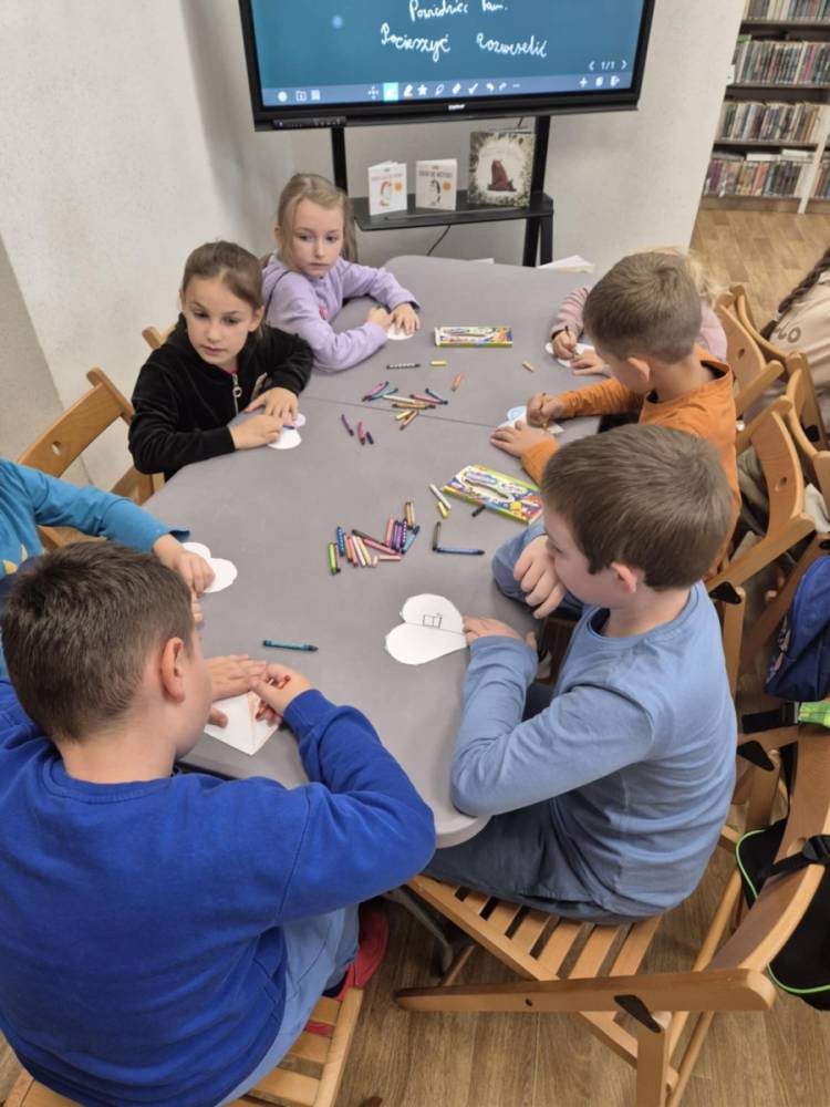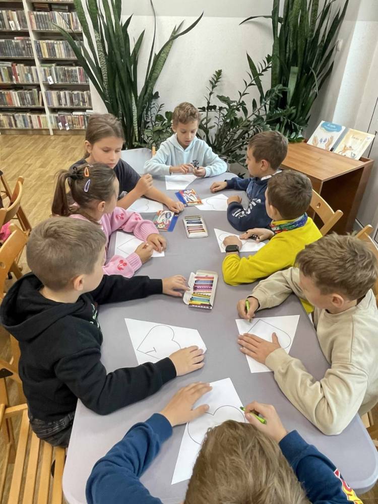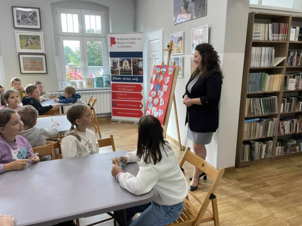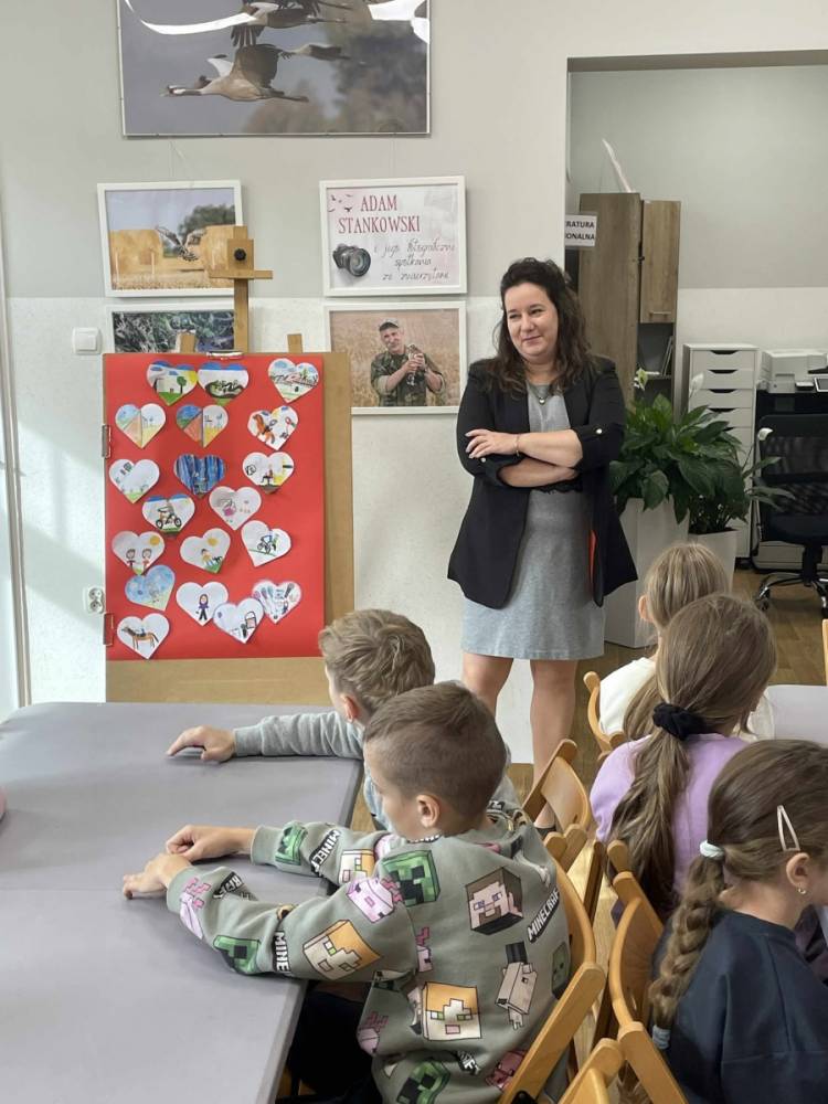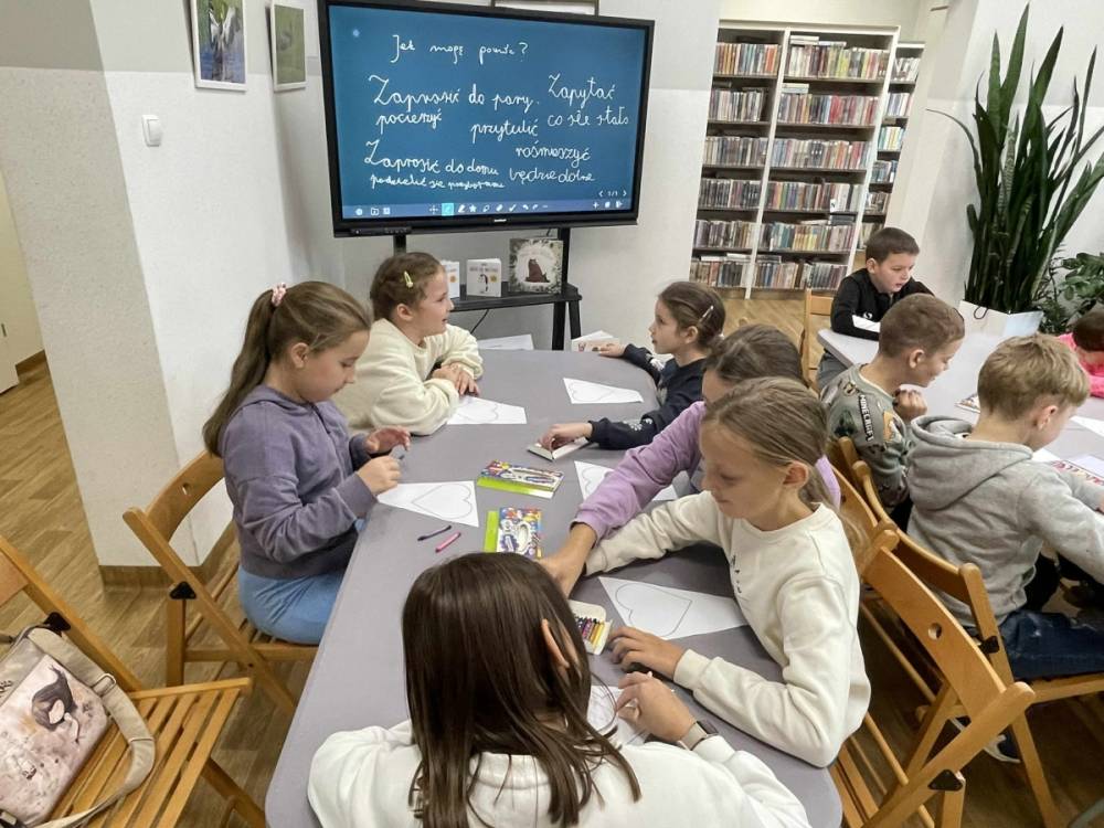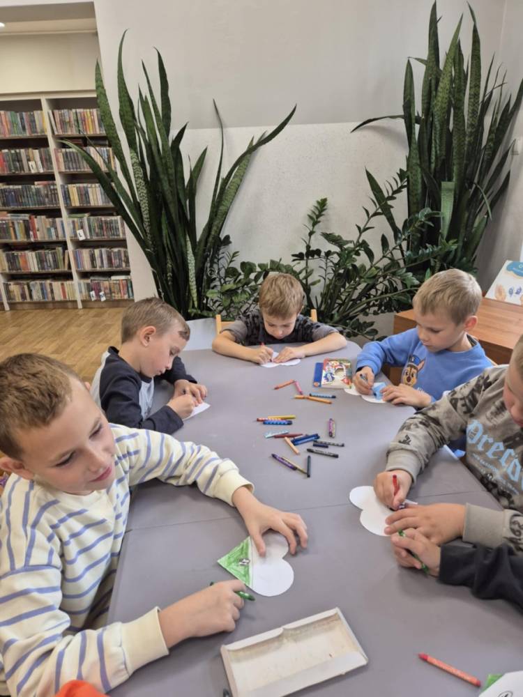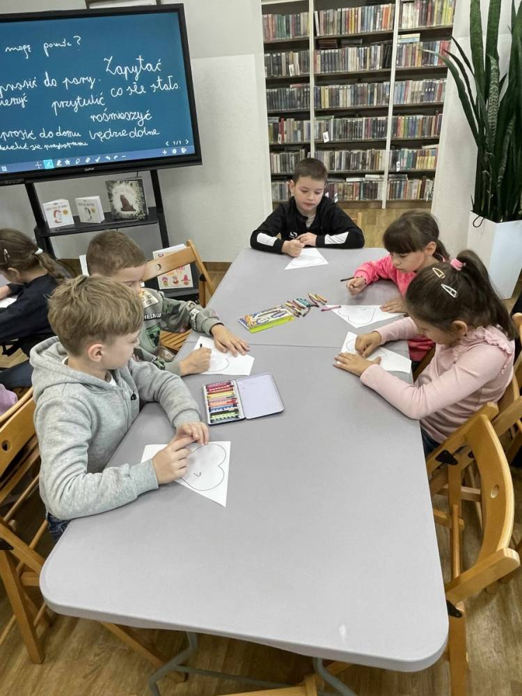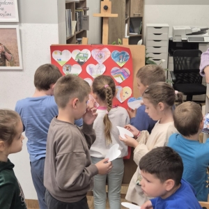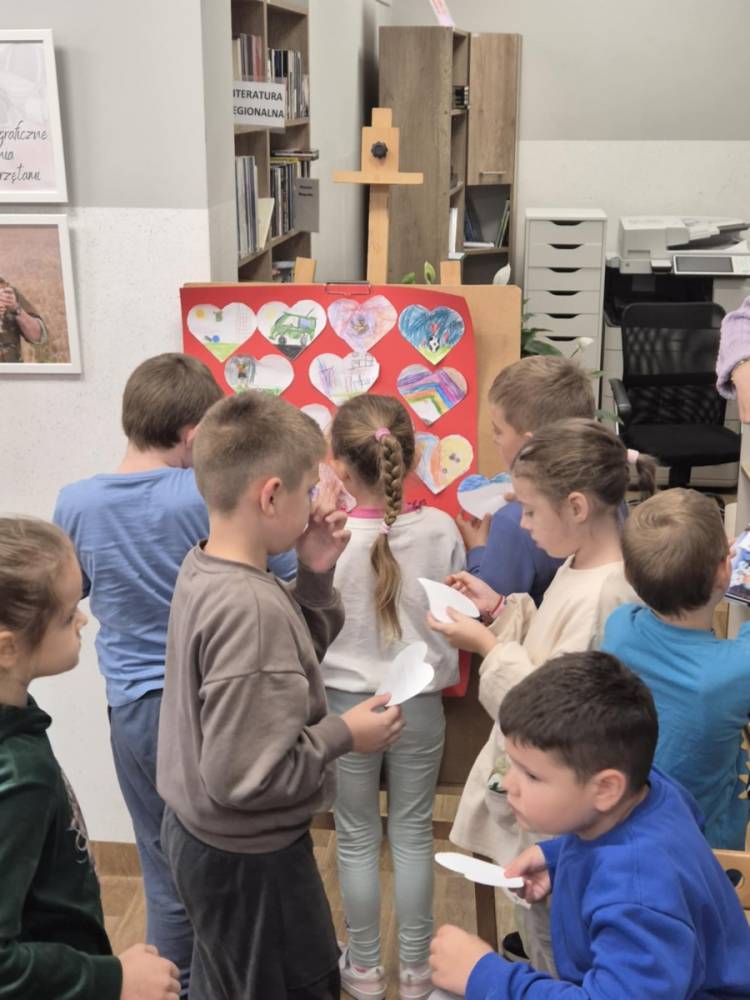 Galeria zdjęć przedstawia uczniów, którzy siedząc na drewnianych krzesłach przy stołach w holu biblioteki, słuchali opowiadanych historii z książki. Niektórzy z nich podchodzili do multimedialnej tablicy, na której zapisywali swoje odpowiedzi na zadane pytania przez prowadzącą zajęcia. Dzieci rysowały na wyciętych serduszkach kolorowymi kredkami i przyklejały je na czerwony bristol. Uczniowie zwiedzali poszczególne pomieszczenia biblioteki, takie jak czytelnie dla dorosłych, dzieci i młodzieży, które znajdują się na parterze i na piętrze budynku biblioteki.