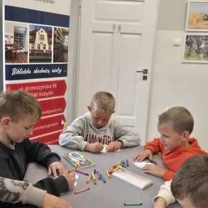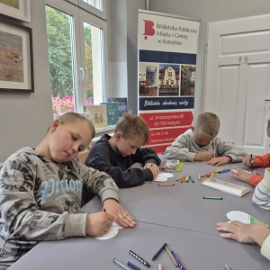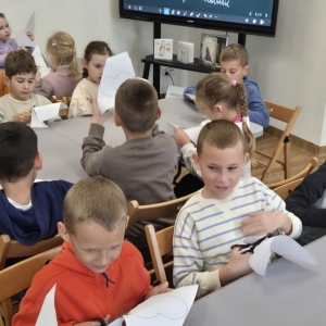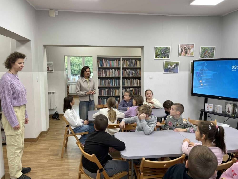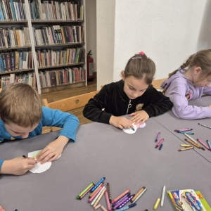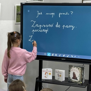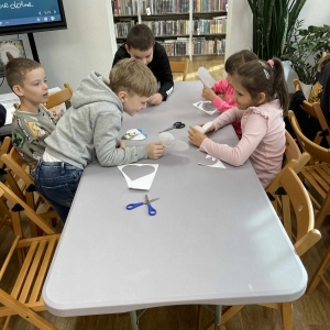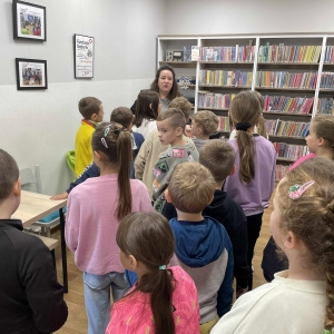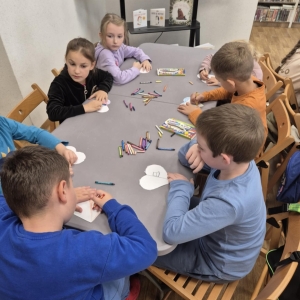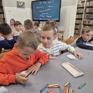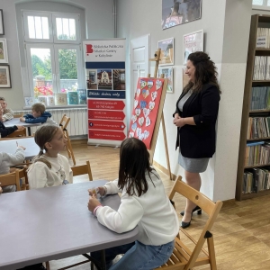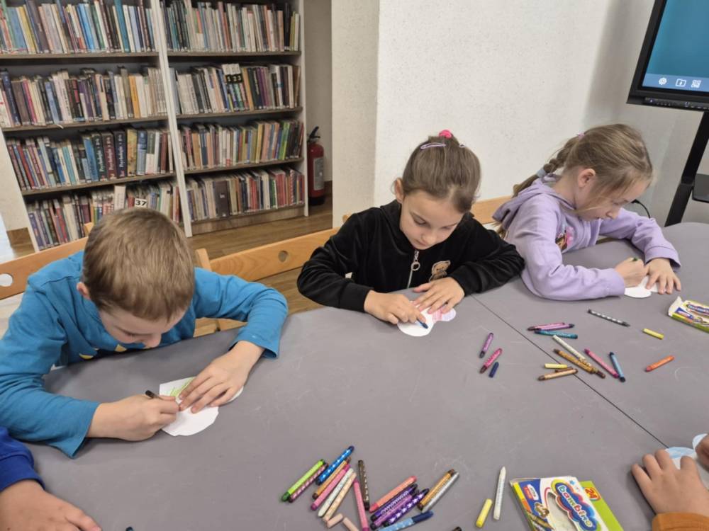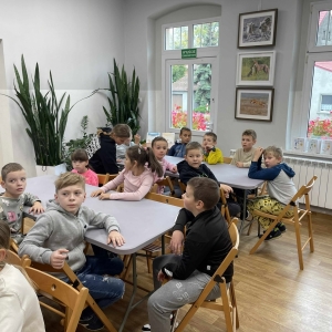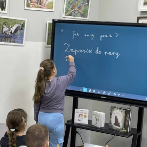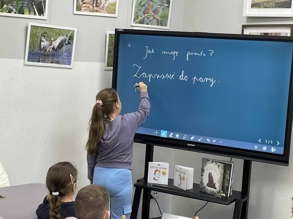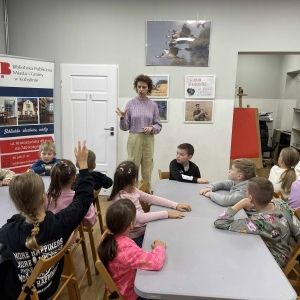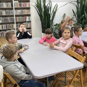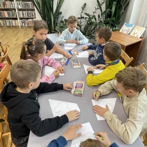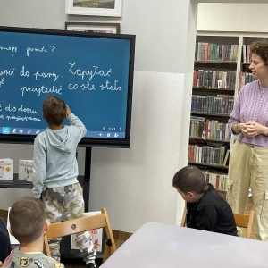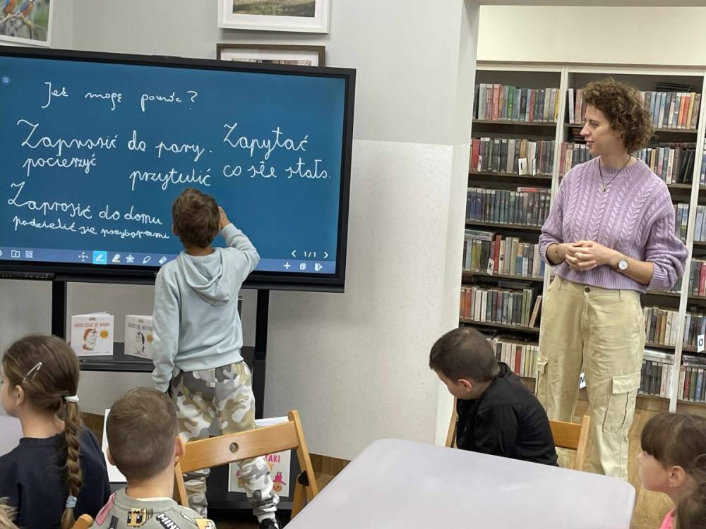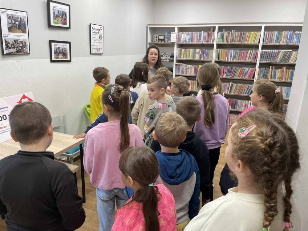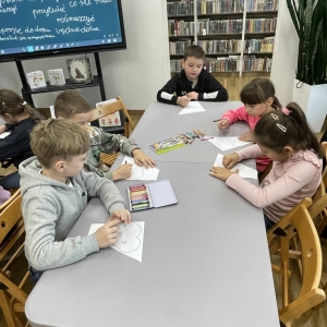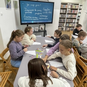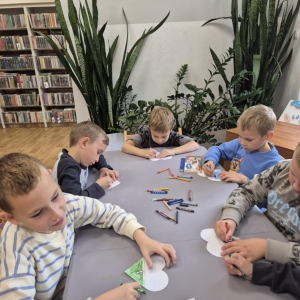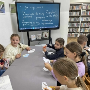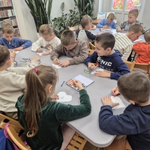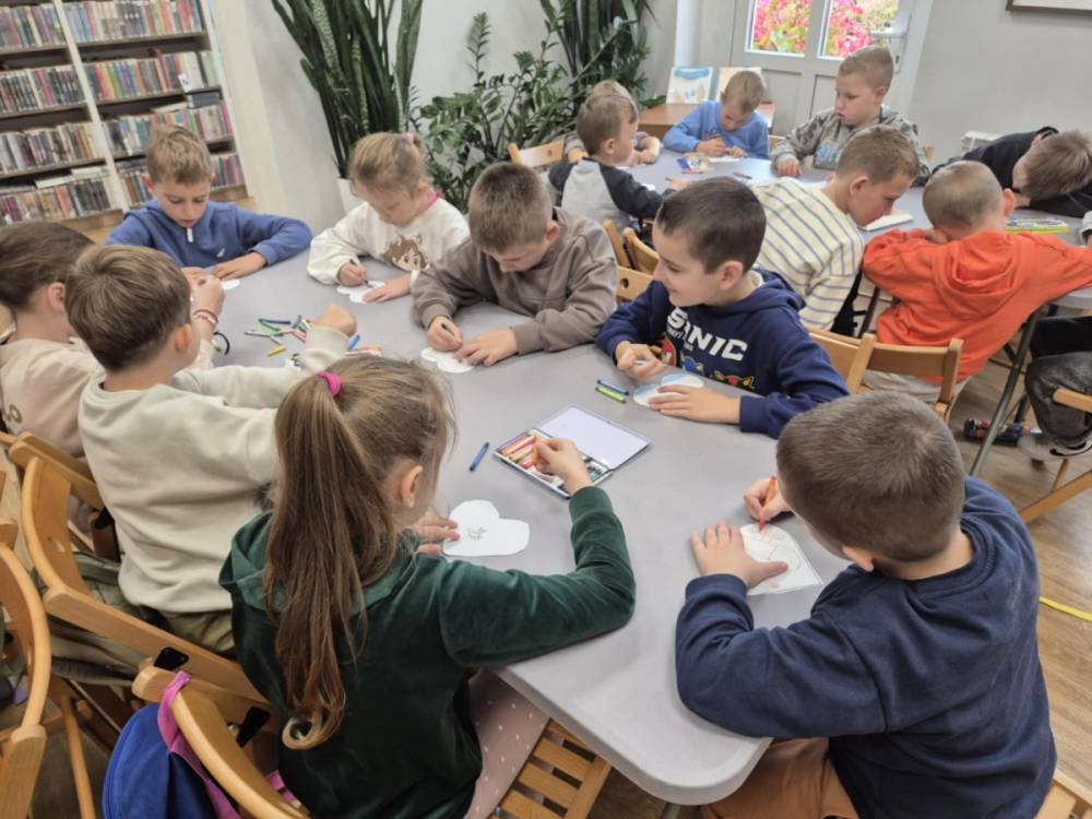 Galeria zdjęć przedstawia uczniów, którzy siedząc na drewnianych krzesłach przy stołach w holu biblioteki, słuchali opowiadanych historii z książki. Niektórzy z nich podchodzili do multimedialnej tablicy, na której zapisywali swoje odpowiedzi na zadane pytania przez prowadzącą zajęcia. Dzieci rysowały na wyciętych serduszkach kolorowymi kredkami i przyklejały je na czerwony bristol. Uczniowie zwiedzali poszczególne pomieszczenia biblioteki, takie jak czytelnie dla dorosłych, dzieci i młodzieży, które znajdują się na parterze i na piętrze budynku biblioteki.