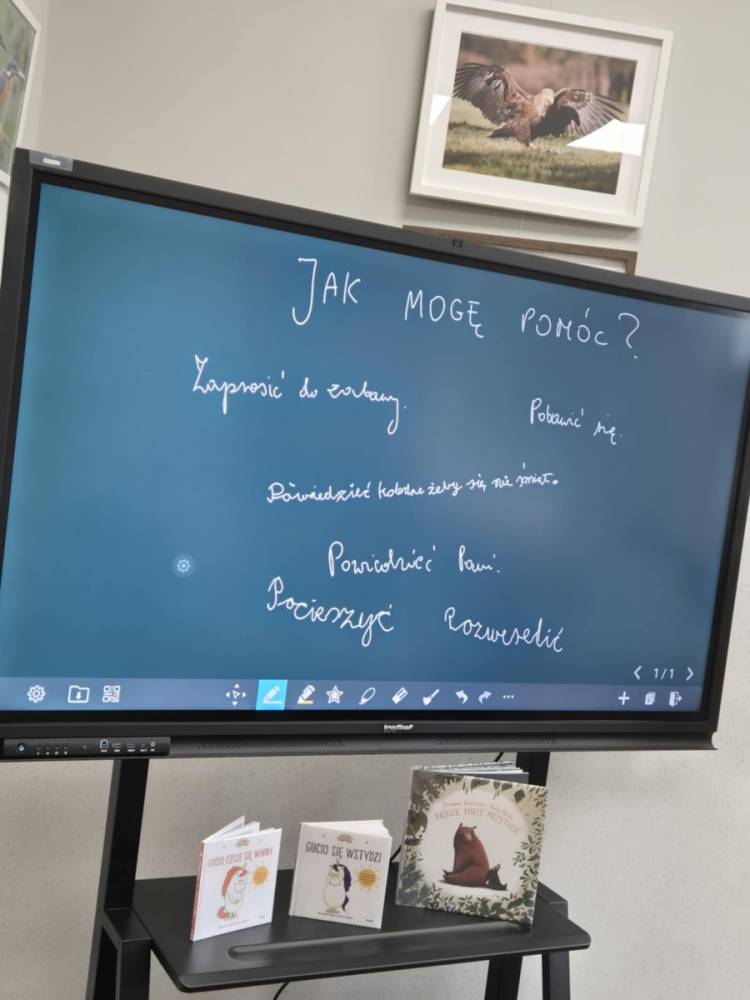 Dzieci wysłuchały dwóch opowiadań: „Nienawiść” oraz „Duma” z książki Janusza Leona Wiśniewskiego pt. „Uczucia. Dziecinne opowieści o tym, co najważniejsze”. Były one punktem wyjścia do rozmowy z dziećmi o różnorodności każdego z nich, o równości i wzajemnym szacunku.