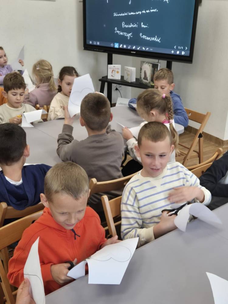 Poruszaliśmy również temat różnorodności ludzi, który sprawia, że jesteśmy wyjątkowi. Dlatego więc dzieci malowały w serduszkach to, co sprawia, że są jedyne w swoim rodzaju – na przykład jakieś własne zainteresowanie, cechę. Uczniowie dowiedzieli się, że „inność” jest ich super mocą.