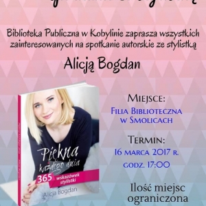 W czwartek, 16 marca 2017 roku w Filii Bibliotecznej w Smolicach (po raz pierwszy w nowym lokalu) odbyło się spotkanie autorskie z Alicją Bogdan - ,,Piękna każdego dnia- spotkanie ze stylistką”. Spotkanie miało na celu zachęcenie użytkowników biblioteki do sięgania po literaturę z zakresu mody, wizażu, kosmetologii i zdrowia.