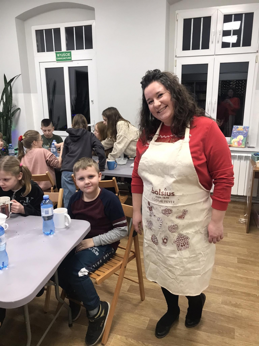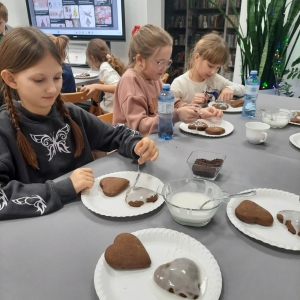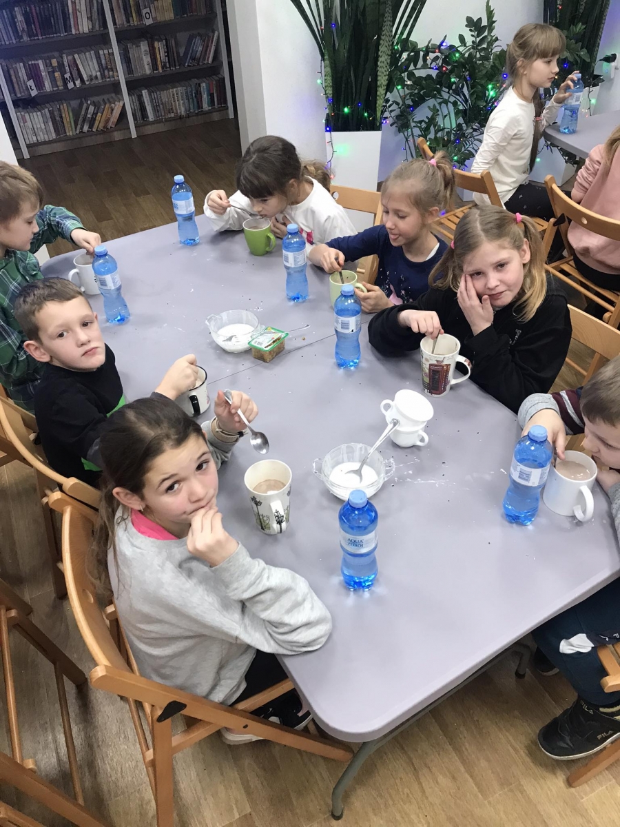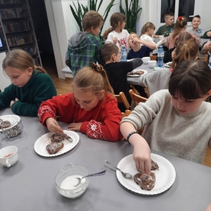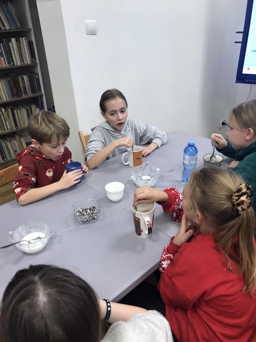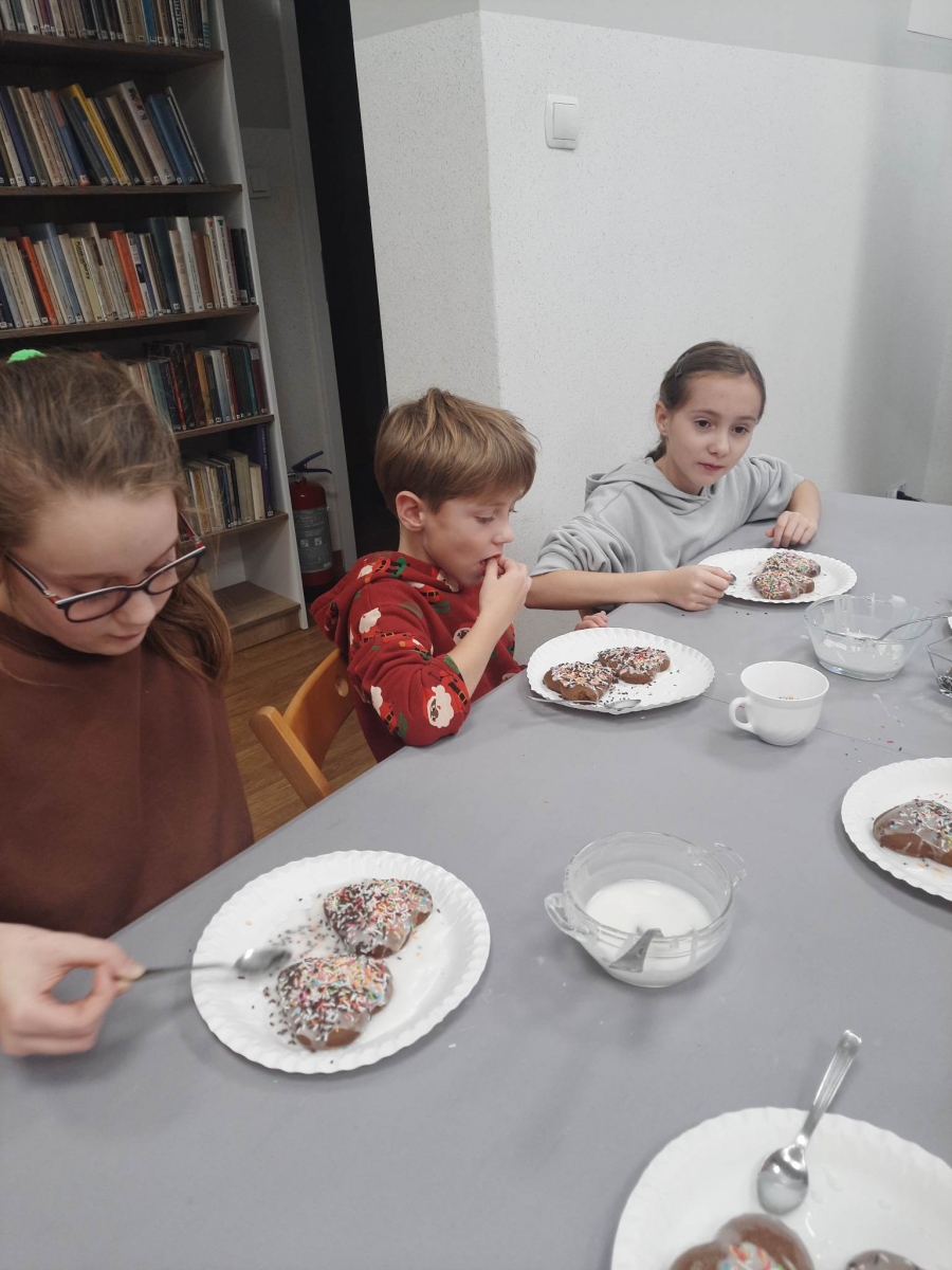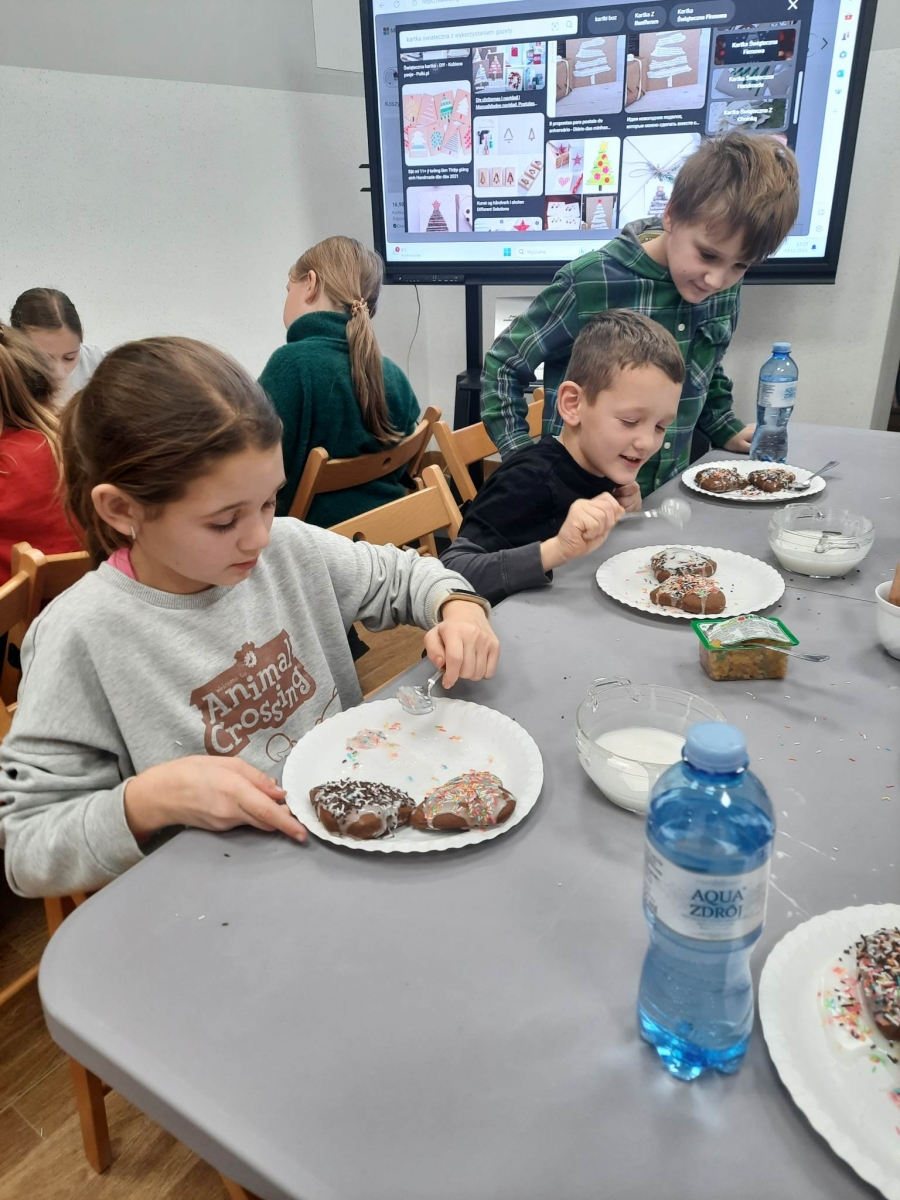 Słuchając świątecznych piosenek, tworzyliśmy przeróżne kartki bożonarodzeniowe z wykorzystaniem wielu materiałów. Po pracy plastycznej skupiliśmy się na części cukierniczej. Mowa o lukrowaniu i ozdabianiu słodkich, korzennych pierników. Był oczywiście czas na ich smakowanie, a przyznajemy, że… smakowały wybornie. Jedząc pierniczki, uczestnicy popijali gorącą czekoladę.