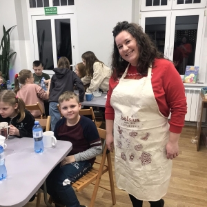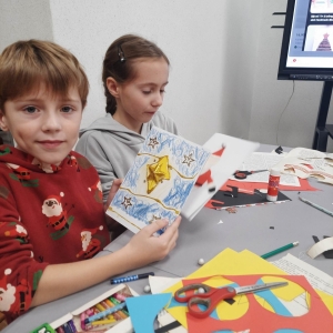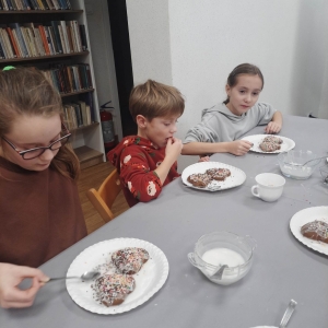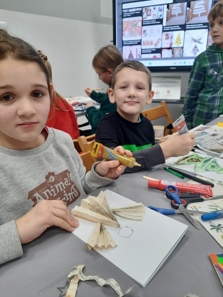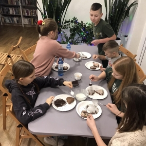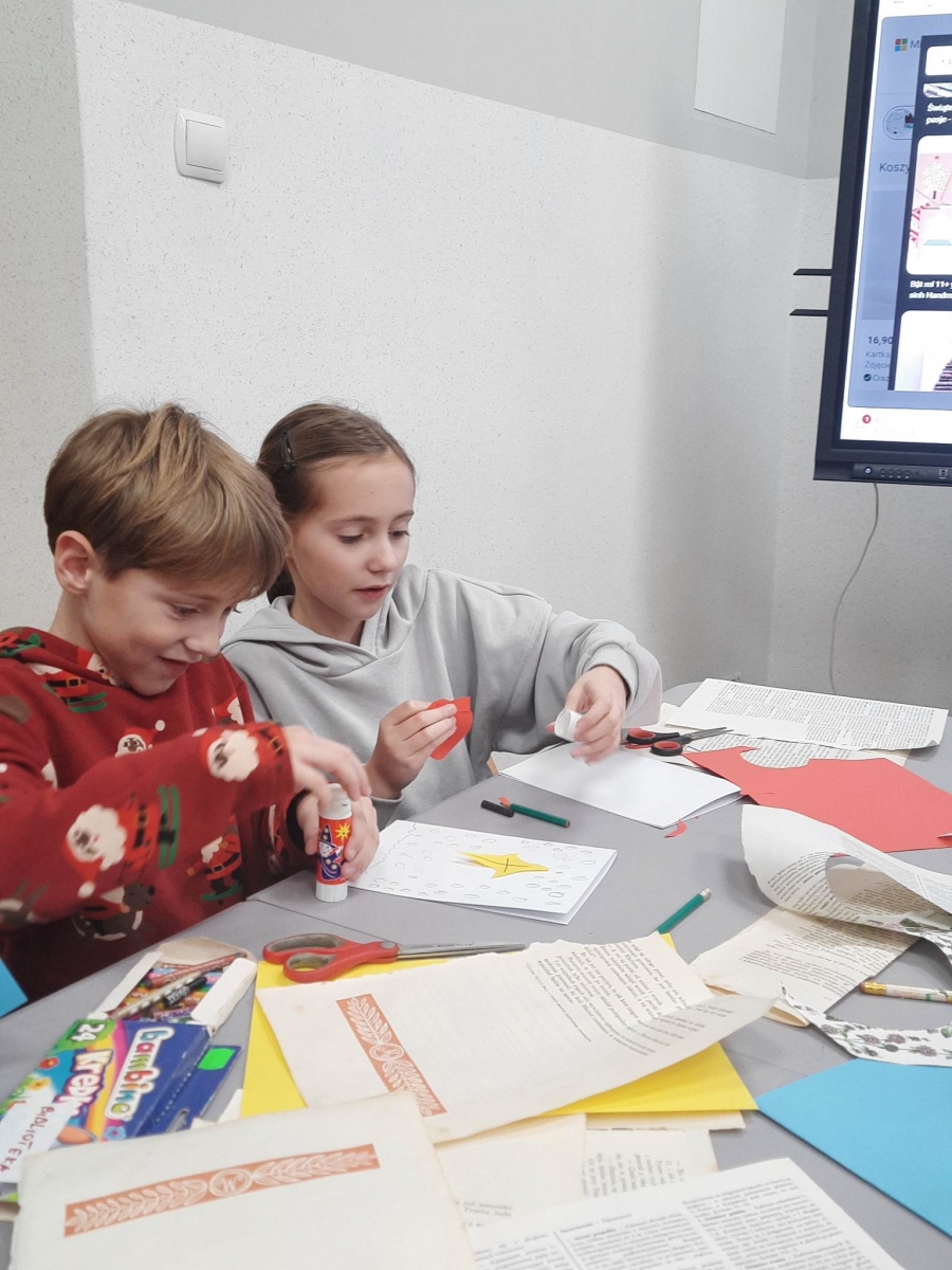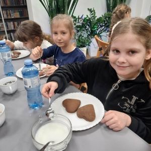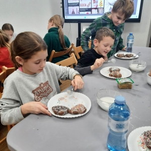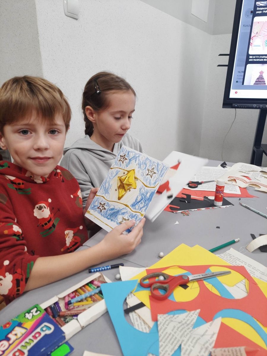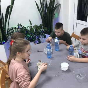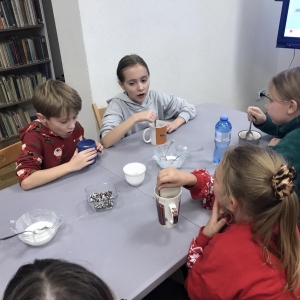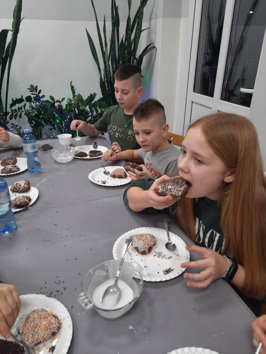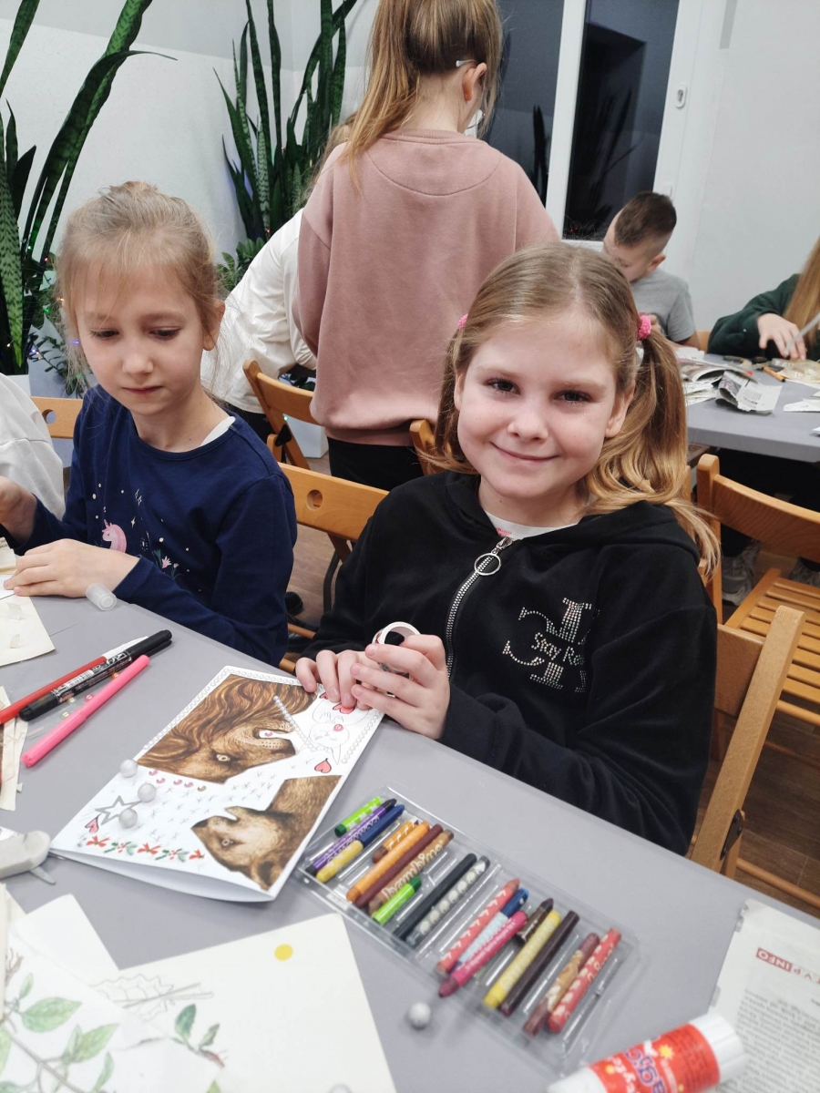 Słuchając świątecznych piosenek, tworzyliśmy przeróżne kartki bożonarodzeniowe z wykorzystaniem wielu materiałów. Po pracy plastycznej skupiliśmy się na części cukierniczej. Mowa o lukrowaniu i ozdabianiu słodkich, korzennych pierników. Był oczywiście czas na ich smakowanie, a przyznajemy, że… smakowały wybornie. Jedząc pierniczki, uczestnicy popijali gorącą czekoladę.