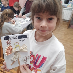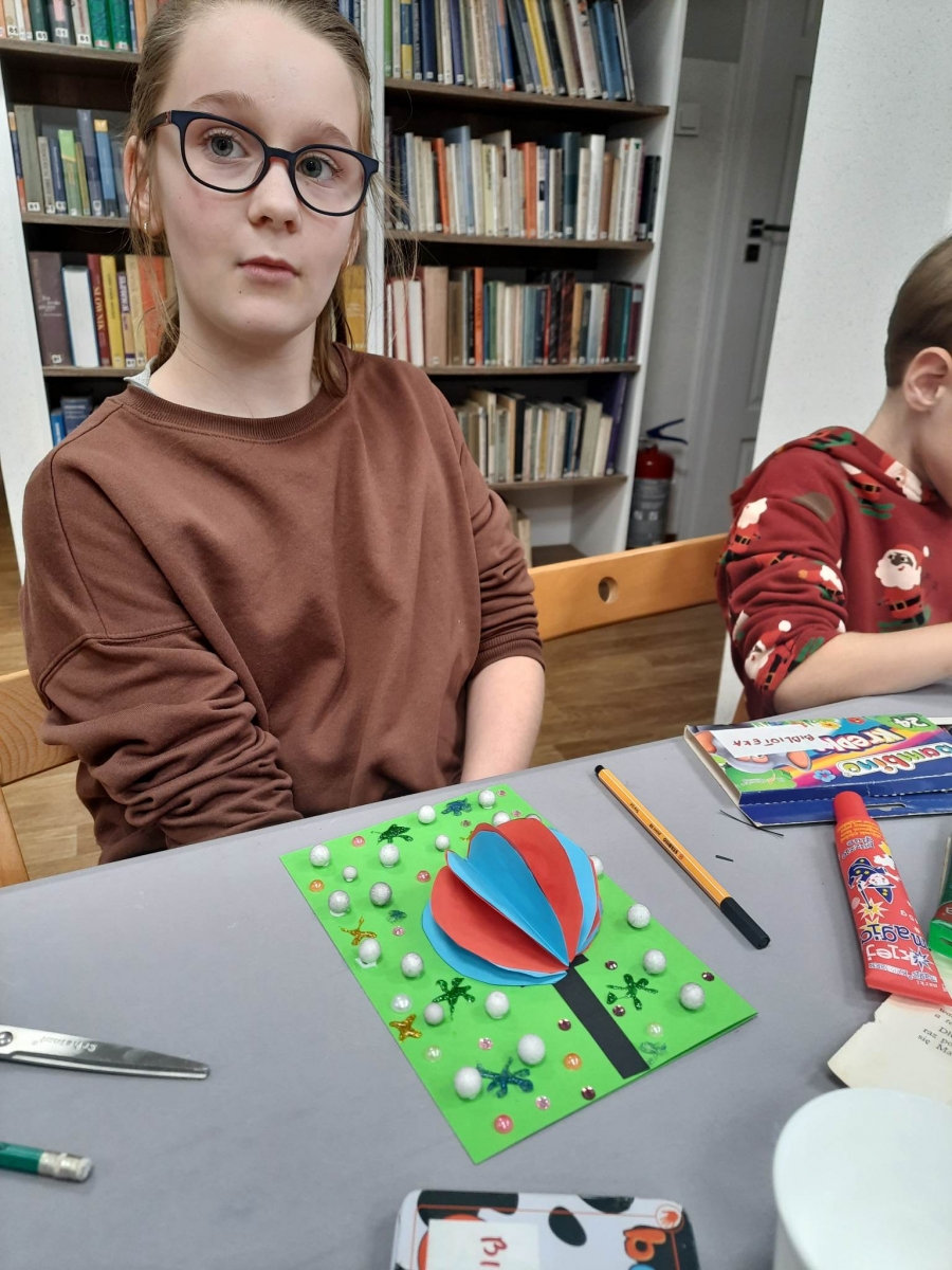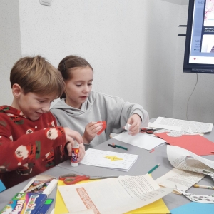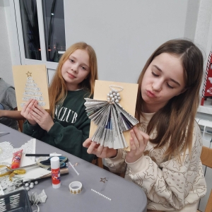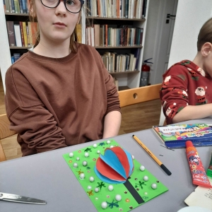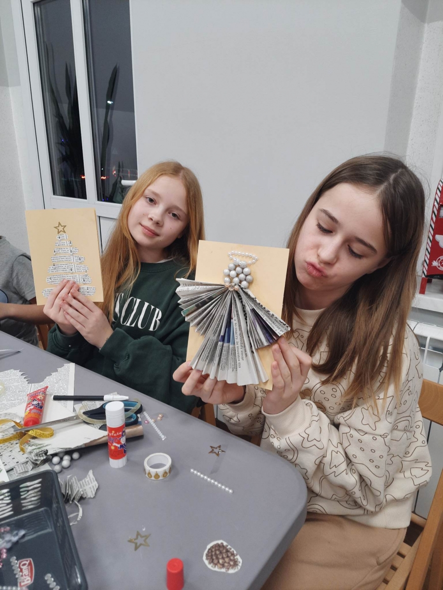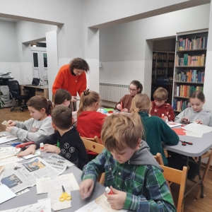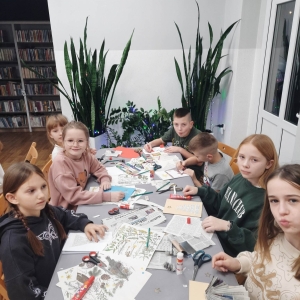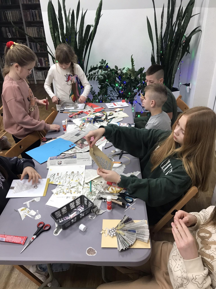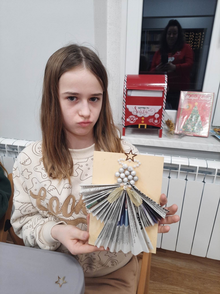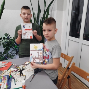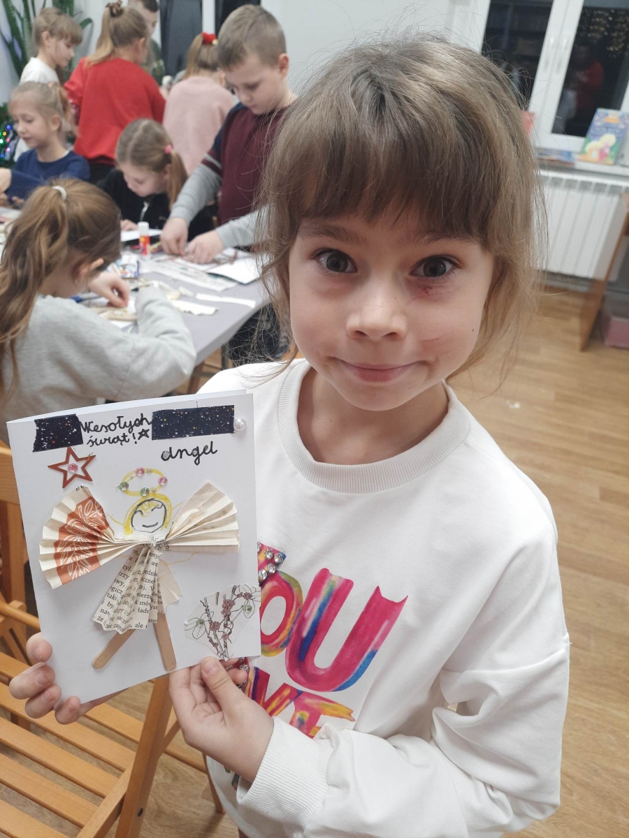 Słuchając świątecznych piosenek, tworzyliśmy przeróżne kartki bożonarodzeniowe z wykorzystaniem wielu materiałów. Po pracy plastycznej skupiliśmy się na części cukierniczej. Mowa o lukrowaniu i ozdabianiu słodkich, korzennych pierników. Był oczywiście czas na ich smakowanie, a przyznajemy, że… smakowały wybornie. Jedząc pierniczki, uczestnicy popijali gorącą czekoladę.