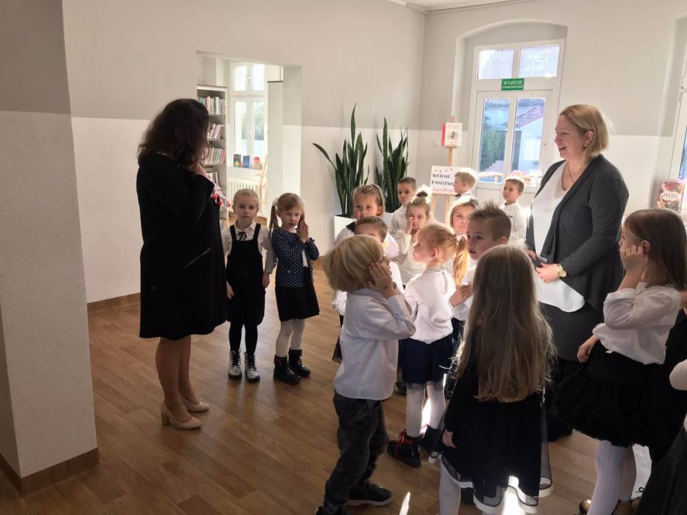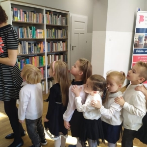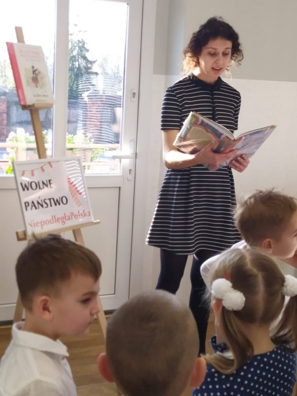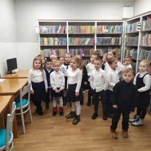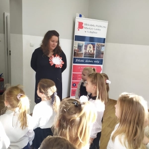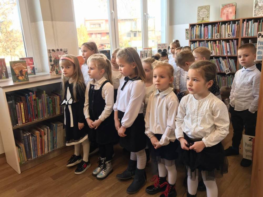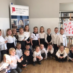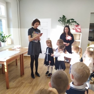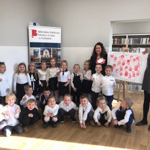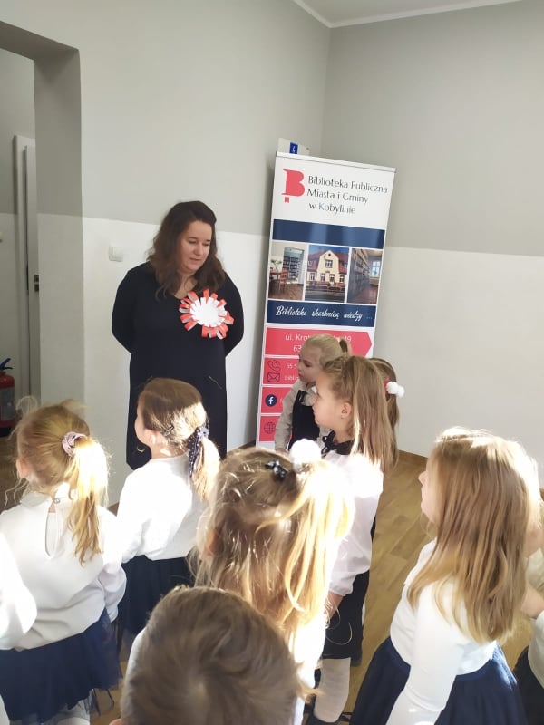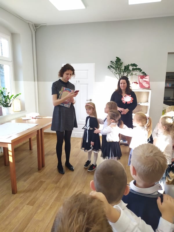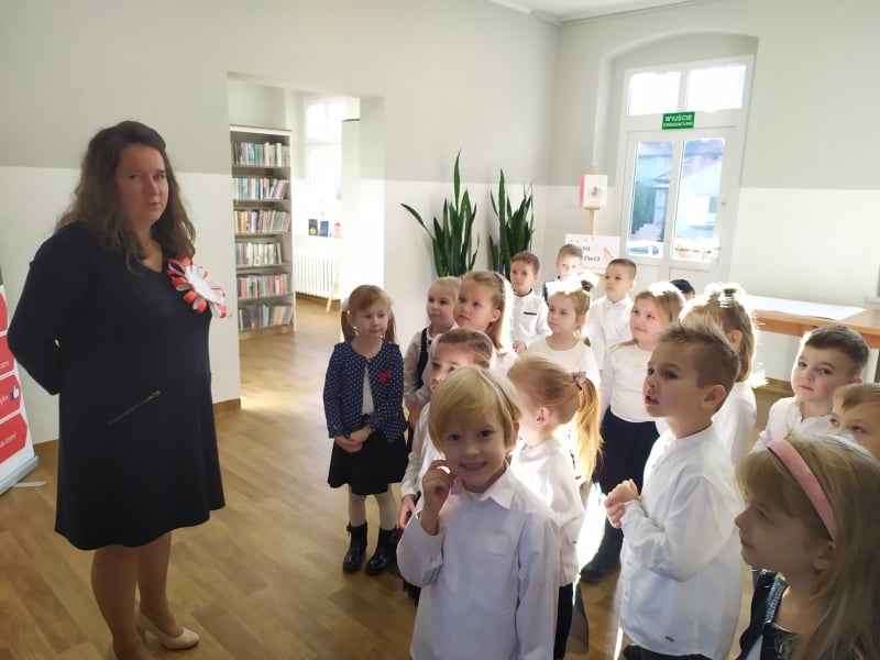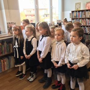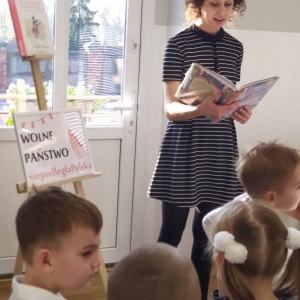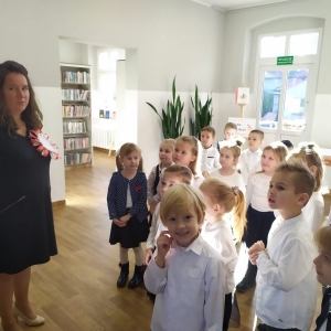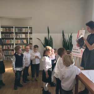 Dzieci z zainteresowaniem słuchały walecznej historii naszej Ojczyzny. Dowiedziały się, że Polacy, aby zachować własny język i obyczaje musieli w konspiracji posługiwać się ojczystym językiem, edukowali dzieci, czytali polskie książki, słuchali pieśni patriotycznych. Jedną z nich, „Rotę” Marii Konopnickiej, zaprezentowała dla najmłodszych pani bibliotekarka – Katarzyna Bella. :-)