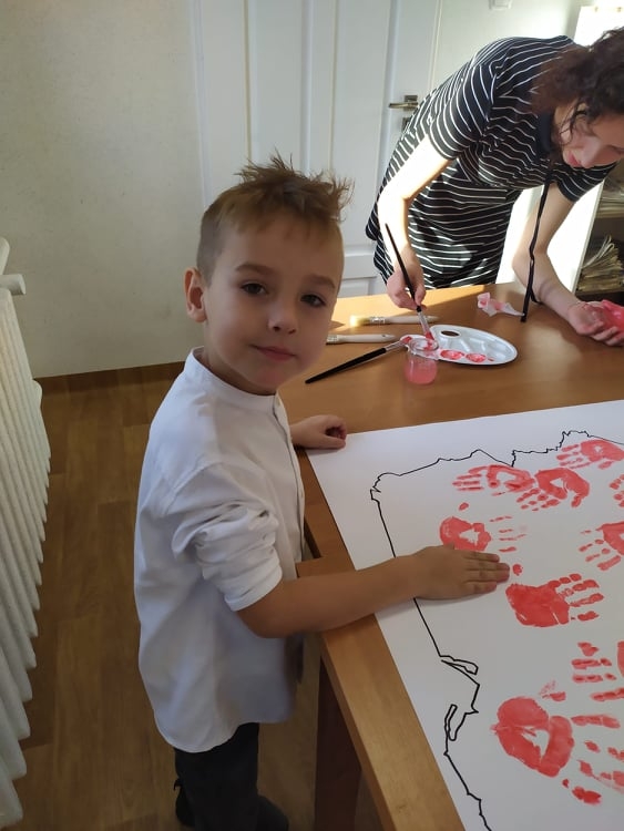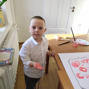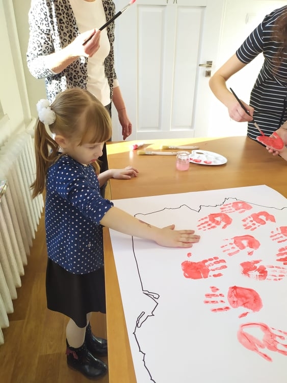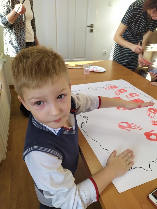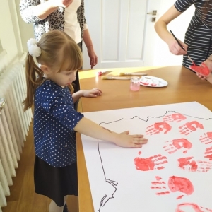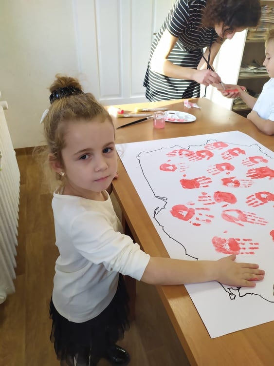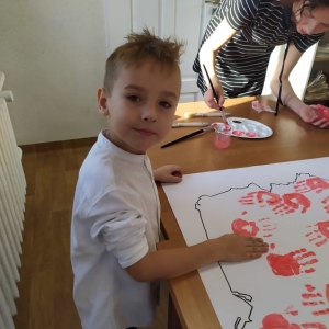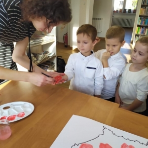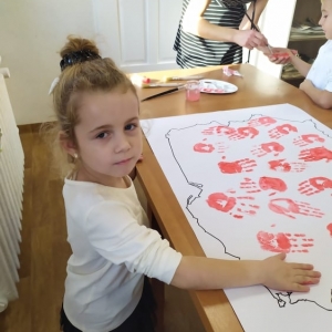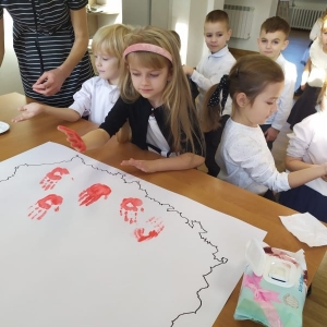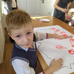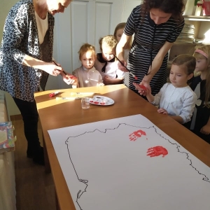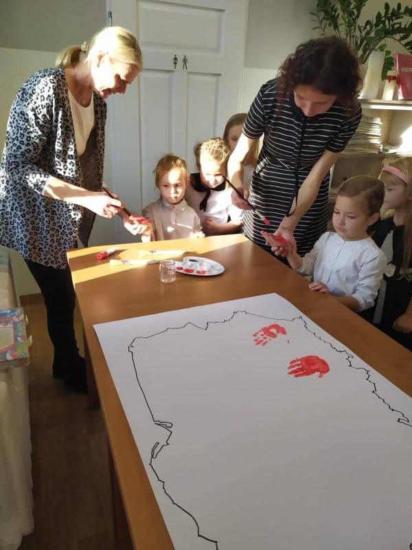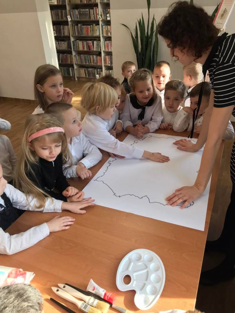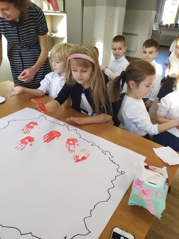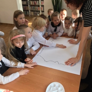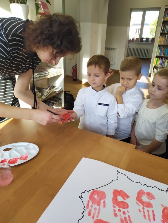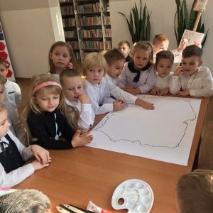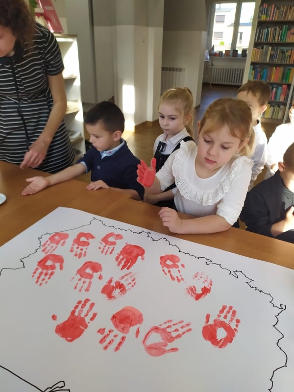 Aby uświadomić dzieciom ich narodowość panie bibliotekarki przygotowały obecną mapę konturową Polski. Każdemu z nich pomalowały rękę czerwoną farbą, po czym najmłodsi kolejno odciskali swoją dłoń na mapie. Poprzez odcisk dłoni dzieci symbolizowały treść: „Jestem Polką/Polakiem!”. :-)