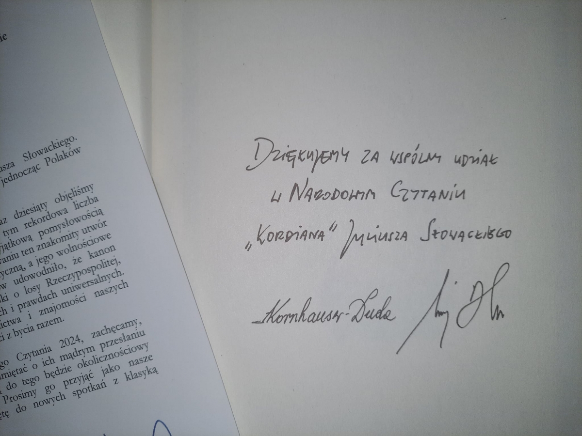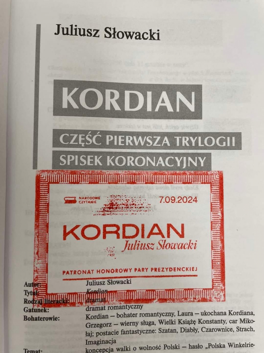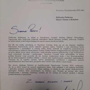 Biblioteka Publiczna Miasta i Gminy w Kobylinie otrzymała oficjalne podziękowania i książkowy upominek od Prezydenta Andrzeja Dudy i jego małżonki Agaty Kornhauser- Dudy za działania promujące tegoroczne Narodowe Czytanie. Przypominamy, że w tym roku z grupą młodzieży czytaliśmy lekturę ,,Kordian" Juliusza Słowackiego. Tworzyliśmy również wyjątkowe kolaże. Poniżej link do wydarzenia, które odbyło się 20 września: https://kobylin.naszabiblioteka.com/n,chill-z-kordianem-zajecia-z-mlodzieza