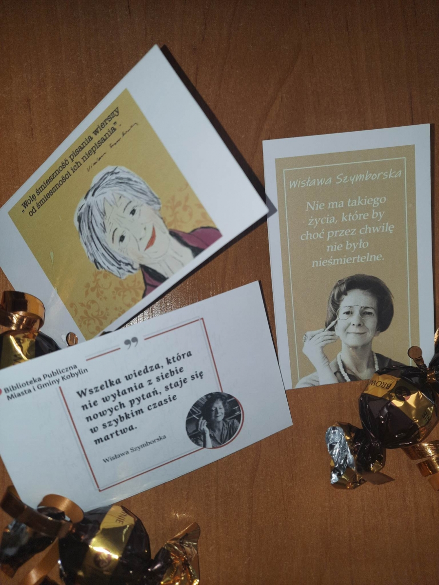 Zapraszamy dzisiaj (poniedziałek-15.05.2023 r.) do Biblioteki Publicznej w Kobylinie po odbiór słodkich pozdrowień od Wisławy Szymborskiej !