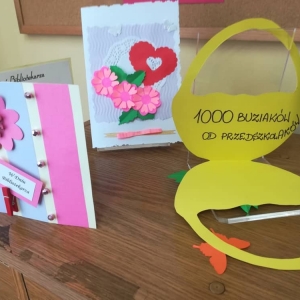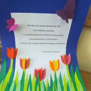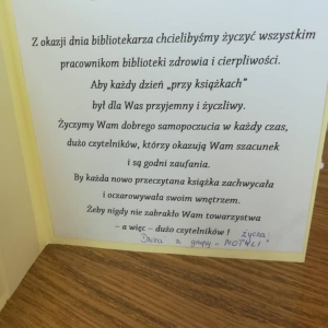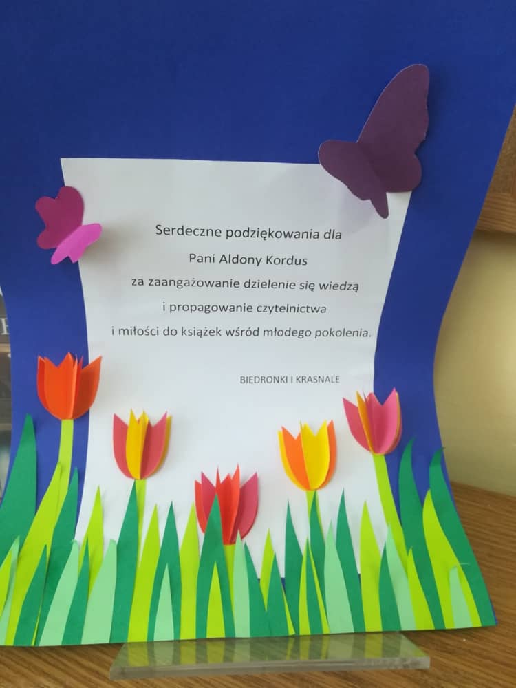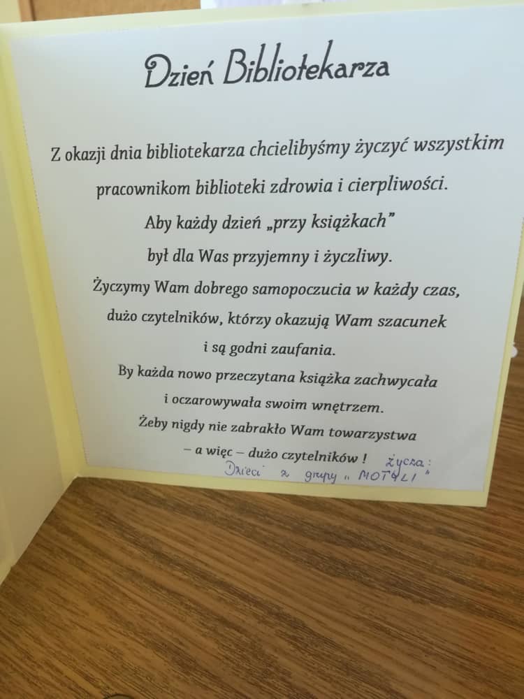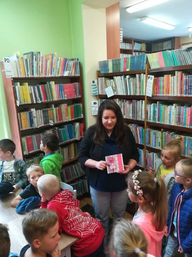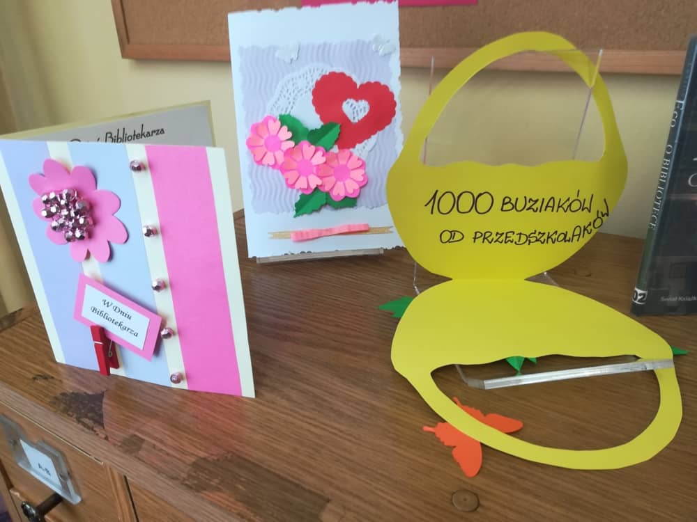 Na zakończenie miłego spotkania przedszkolacy w ramach podziękowań wręczyli bibliotekarkom laurki, a one odwdzięczyły się cukierkami.