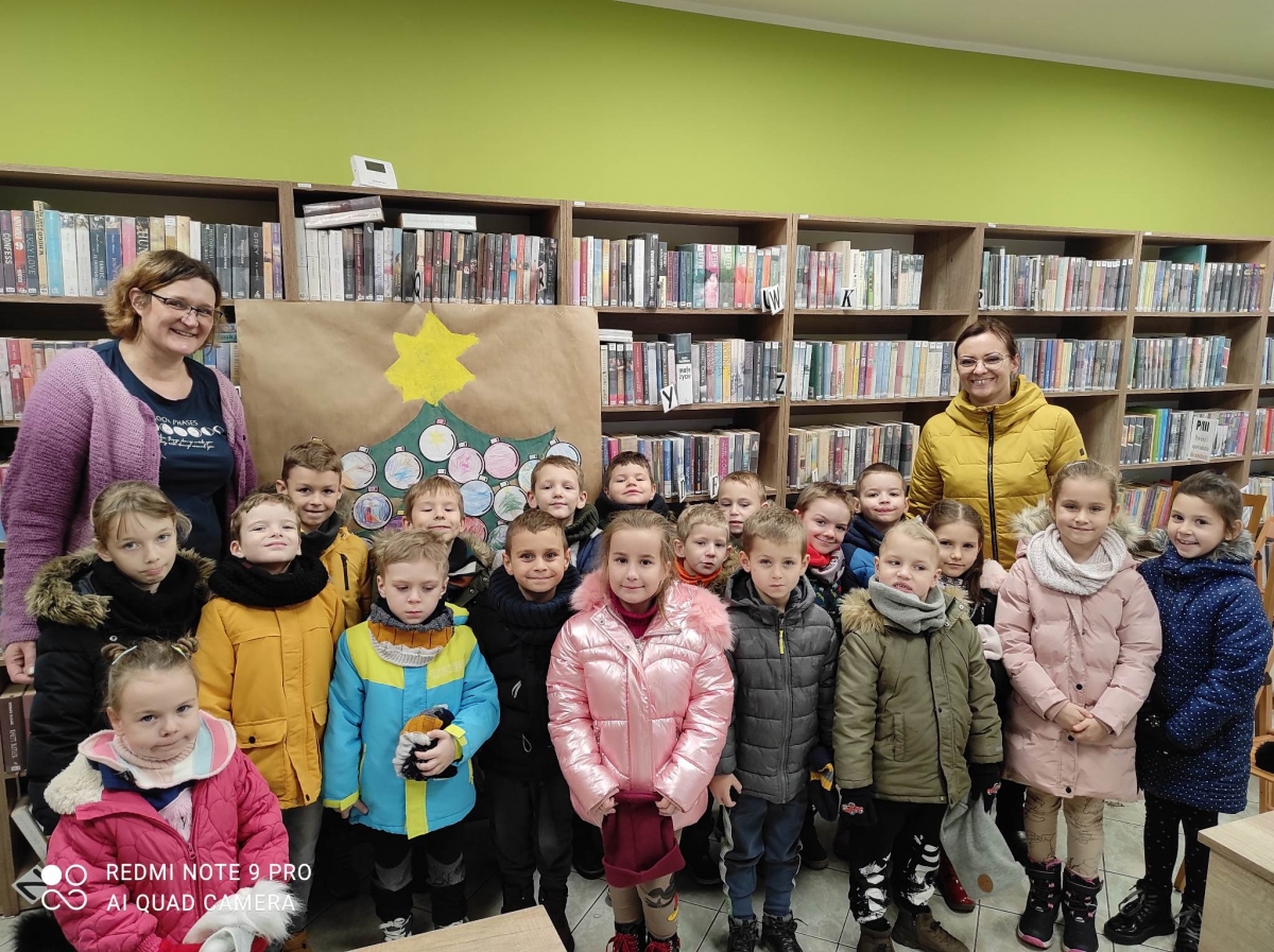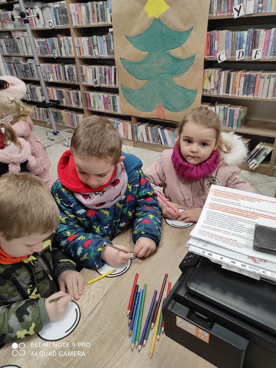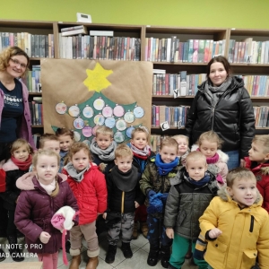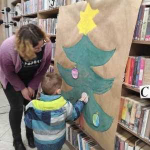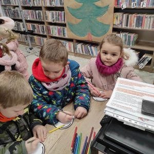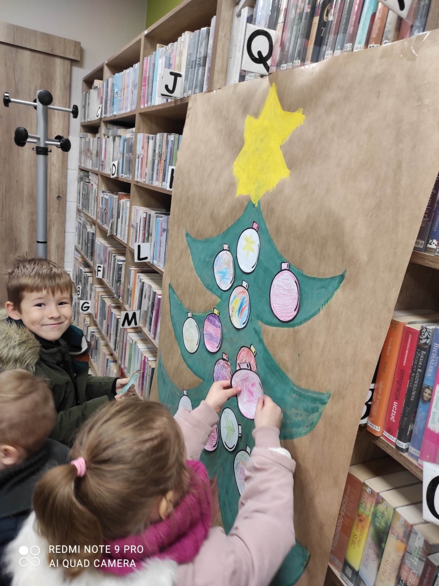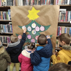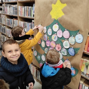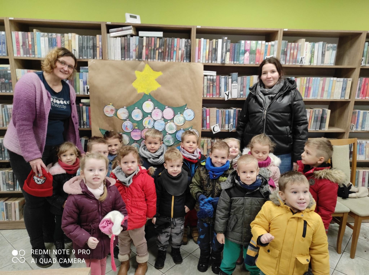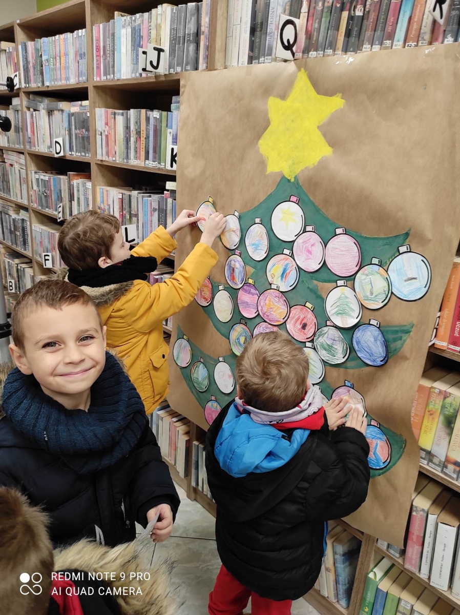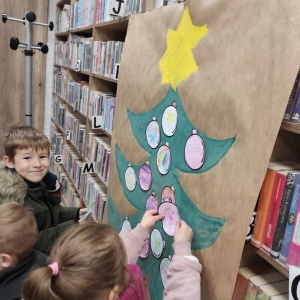 12 grudnia 2022 r. do Filii Bibliotecznej w Smolicach zawitały dzieci z miejscowego przedszkola, z grupy Sówek oraz Pszczółek. Okazją do wizyty w bibliotece były zbliżające się Święta Bożego Narodzenia. Młodzi czytelnicy z uwagą wysłuchali opowiadania „ Choinka” Sally Gilmore, nawiązującego do Gwiazdki. Po lekturze nasi milusińscy dostali zadanie do wykonania. Należało ozdobić otrzymane bombki z papieru według własnego pomysłu. Dzieci z wielkim zaangażowaniem zabrały się do pracy, a wykonanymi przez siebie ozdobami ustroiły papierową choinkę. Na zakończenie spotkania młodzi czytelnicy otrzymali świąteczne kolorowanki oraz listę świątecznych obowiązków.