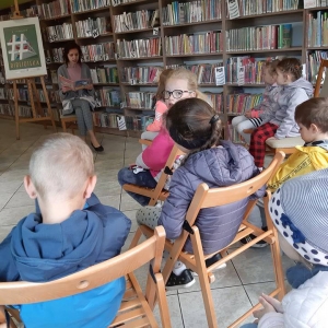 Pani bibliotekarka przeczytała dzieciom bajkę Anity Głowińskiej pt. „Kicia Kocia w bibliotece”. Jest to opowiadanie o przygodach Kici Koci, która razem z mamą pierwszy raz odwiedza bibliotekę. Główna bohaterka uświadamia sobie, że biblioteka to nie tylko miejsce, w którym wypożycza się książkę, ale także placówka oferująca wiele ciekawych zajęć, takich jak warsztaty plastyczne, zajęcia animacyjne dla dzieci czy spotkanie z autorem książki, w którym Kicia Kocia miała przyjemność wziąć udział. Dzieci z uwagą wysłuchały bajki, po czym wspólnie opowiedziały z czym kojarzy im się biblioteka i w jakich zajęciach brali udział w książnicy.